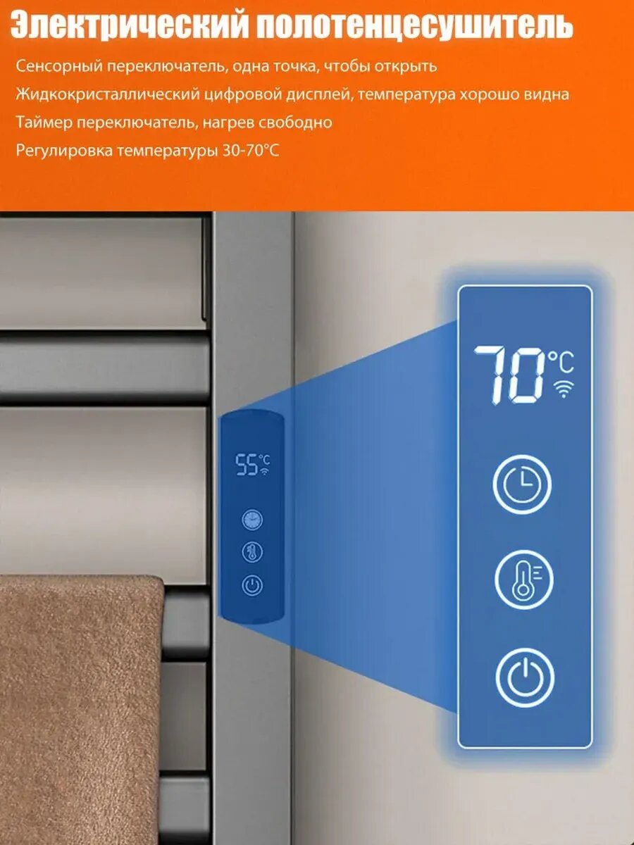 Полотенцесушитель, электрический, 95Вт, 30-70°C, функция таймера, скрытый монтаж, цвет черный интересное: