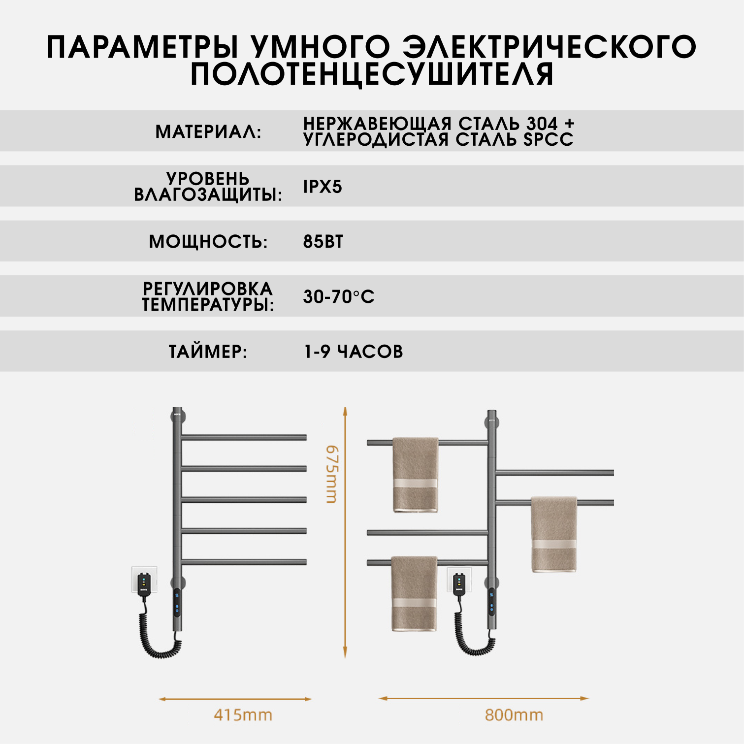 Серый Полотенцесушитель Электрический 415мм 675мм Е-образная форма интересное: