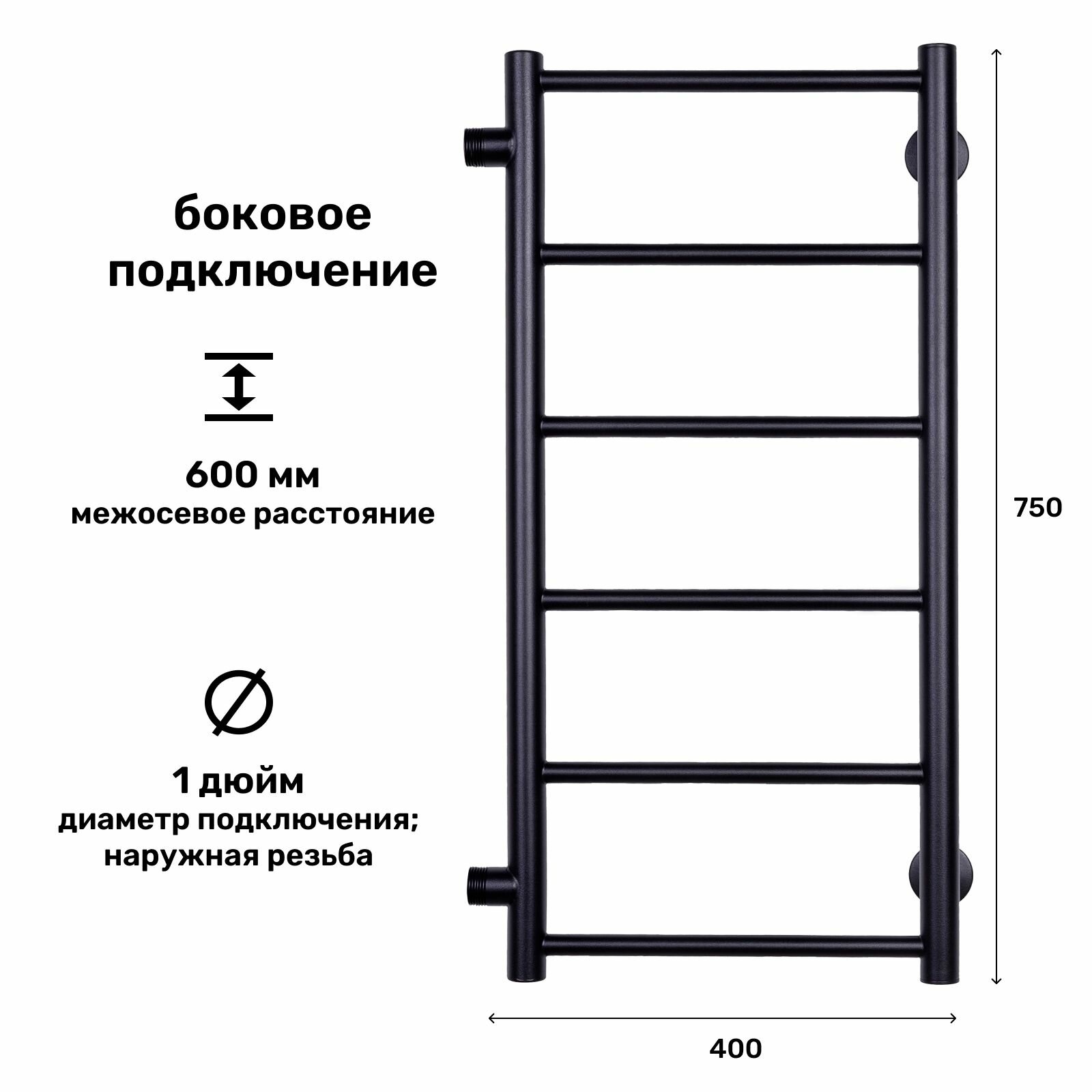 Купить Полотенцесушитель Лесенка Прямая 750х400 черный матовый боковое подключение 1 дюйм