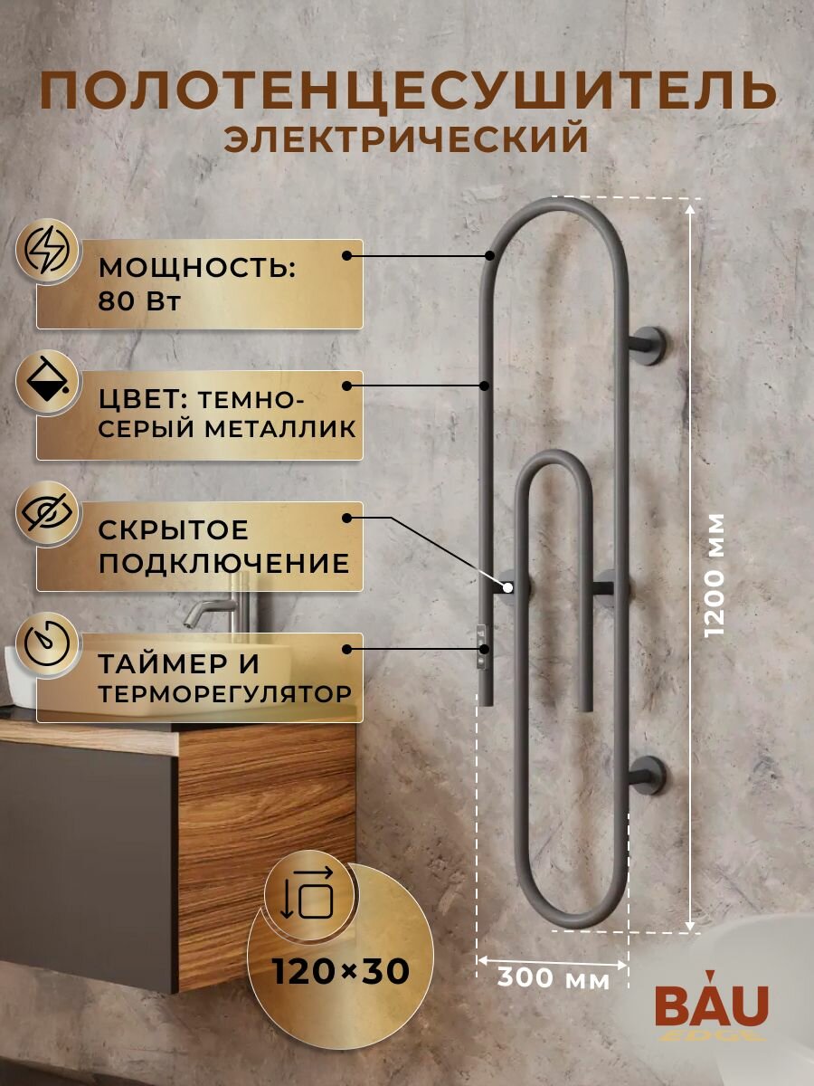 Полотенцесушитель дизайнерский электрический BAU Wall Clip Gun Grey 120х30, темно-серый металлик интересное:
