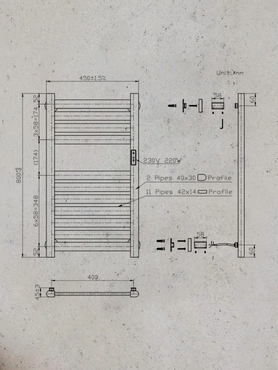 Полотенцесушитель дизайнерский электрический BAU Elite Elegant Gun Grey 60х45, подключение справа, темно-серый металлик