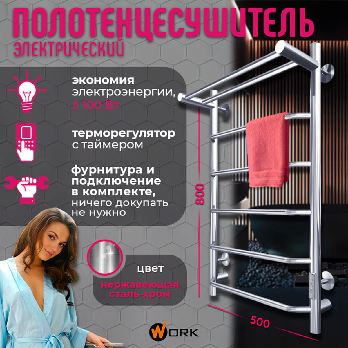 Полотенцесушитель электрический WORK-Оливер 80x50 в ванную с терморегулятором, хром, универсальное подключение