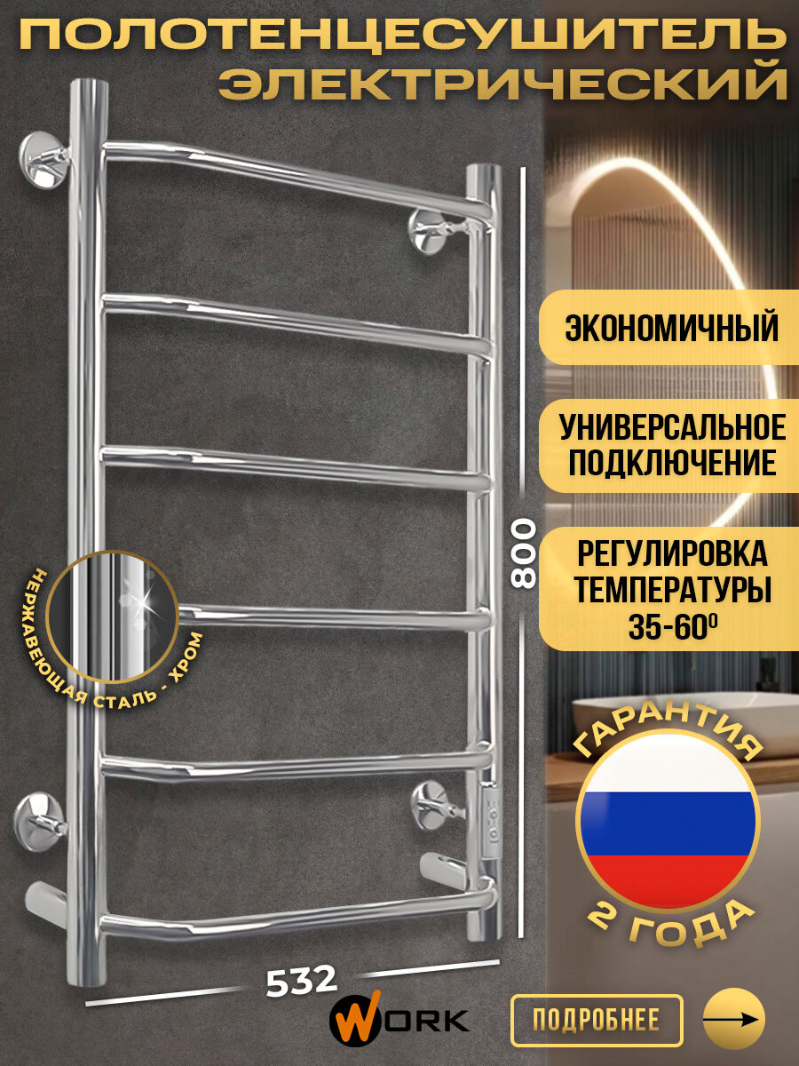 Купить Полотенцесушитель электрический WORK-Оливер 80x50 в ванную с терморегулятором, хром, универсальное подключение
