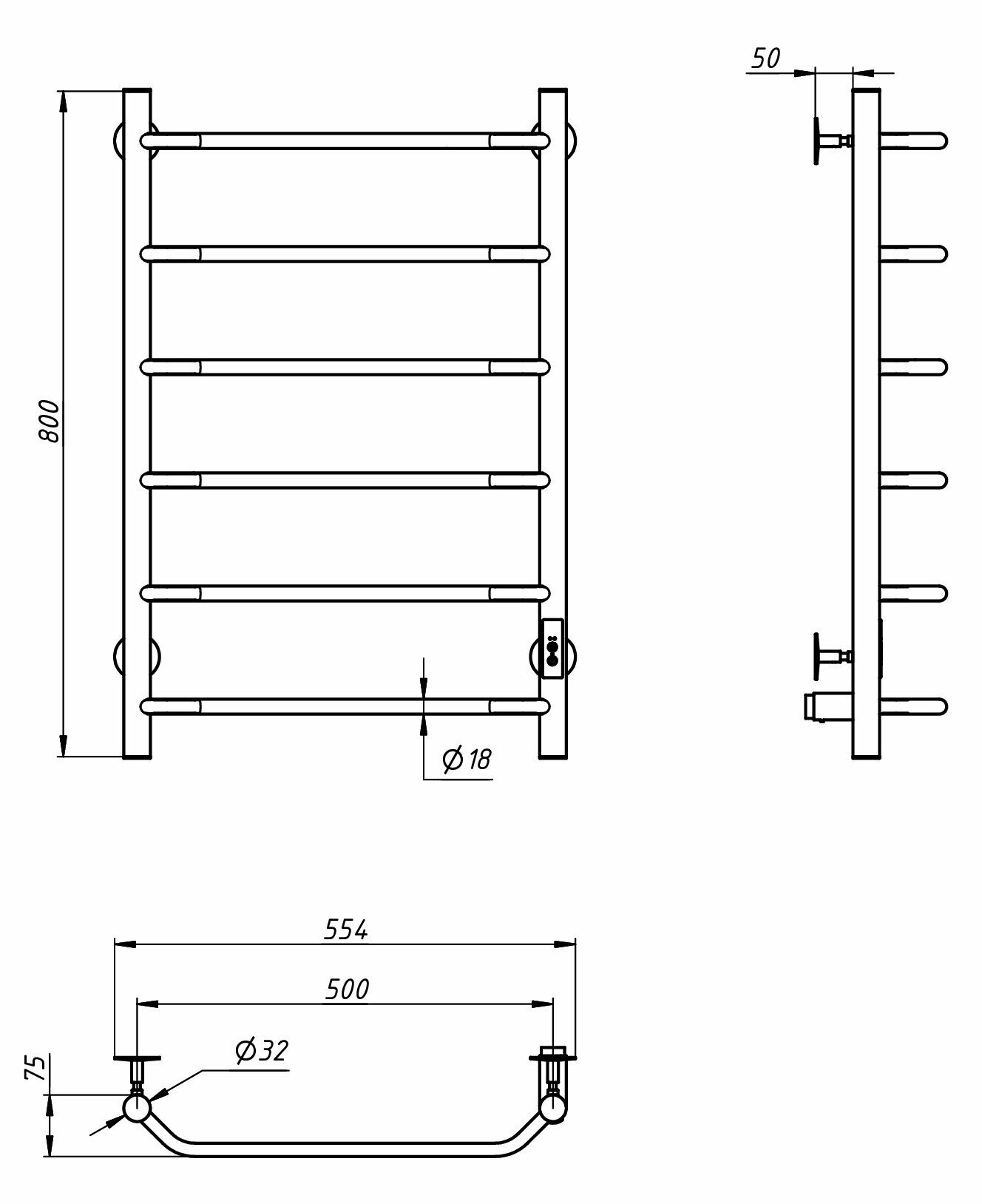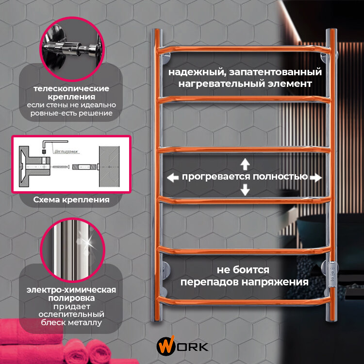 Полотенцесушитель электрический WORK-Паритет 80x50 в ванную с терморегулятором, 5 перекладин, универсальное подключение