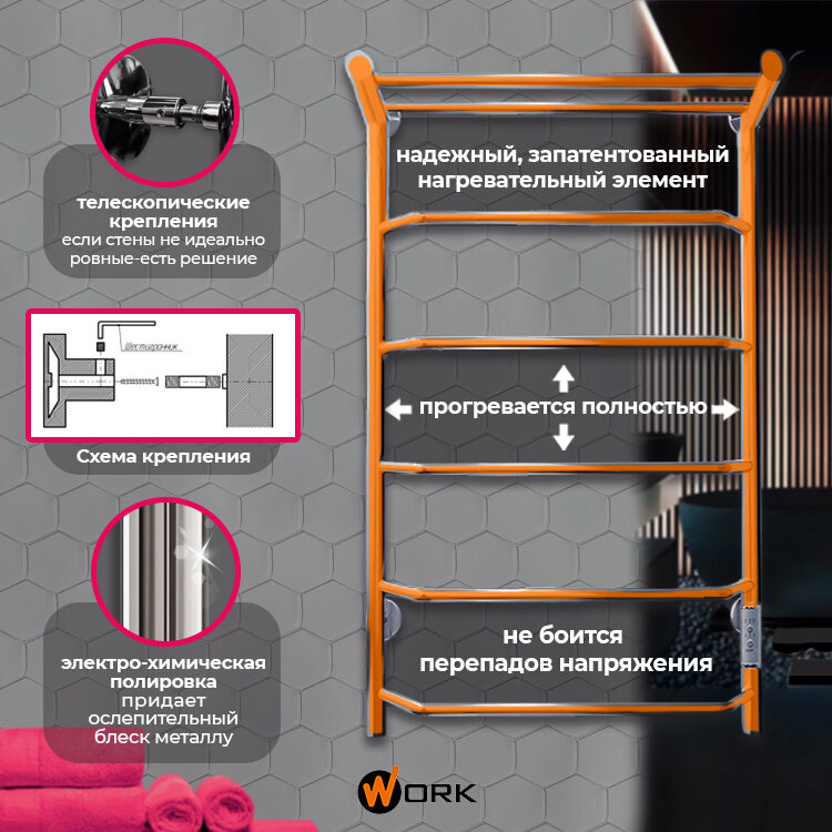 Полотенцесушитель электрический WORK-Паритет 80x50 в ванную с терморегулятором, 5 перекладин, универсальное подключение