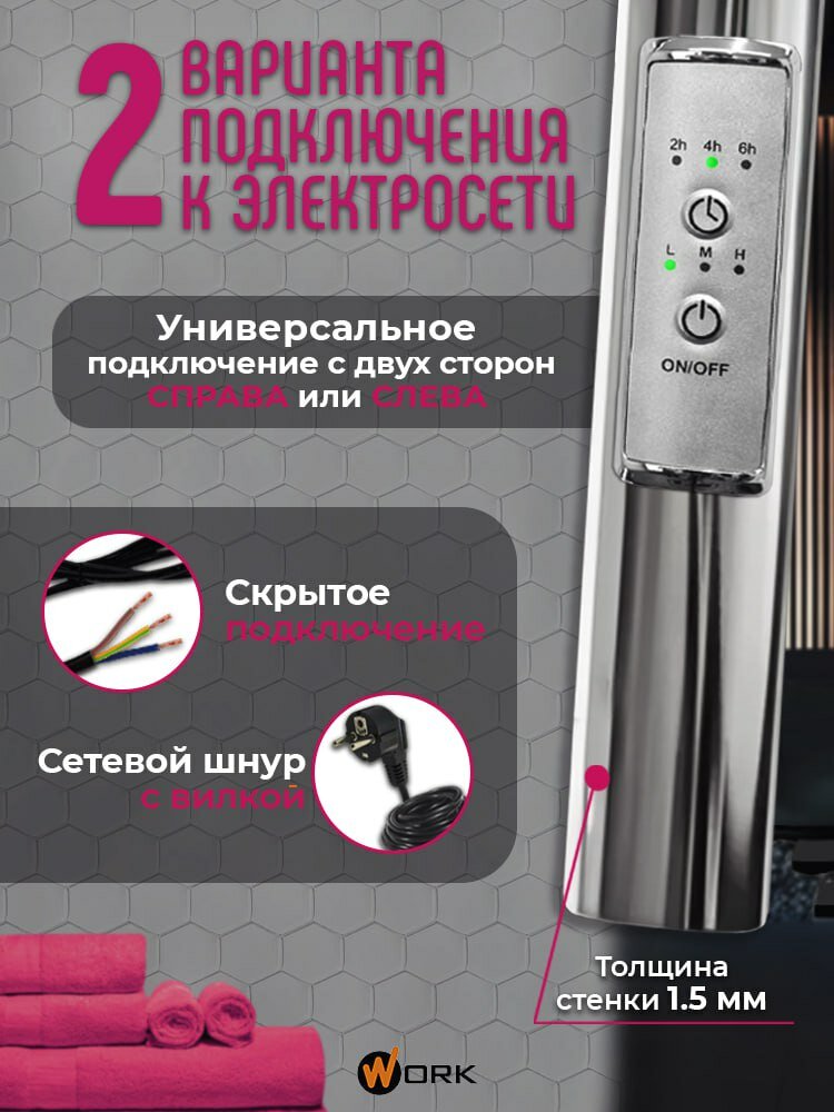 Полотенцесушитель электрический WORK-Оливер 80x50 в ванную с терморегулятором, хром, универсальное подключение