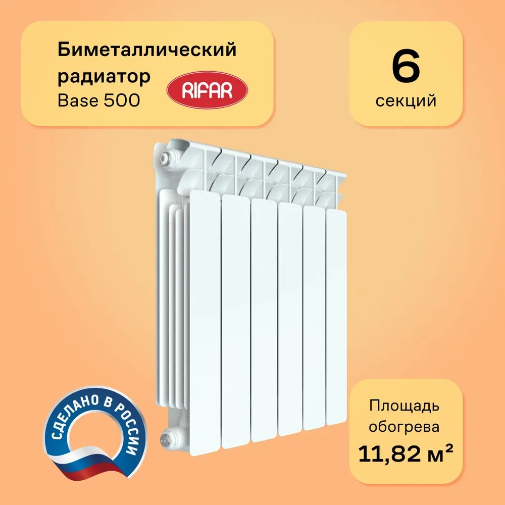 Купить Радиатор биметаллический RIFAR Base 500 6 секций, цвет белый, подключение боковое