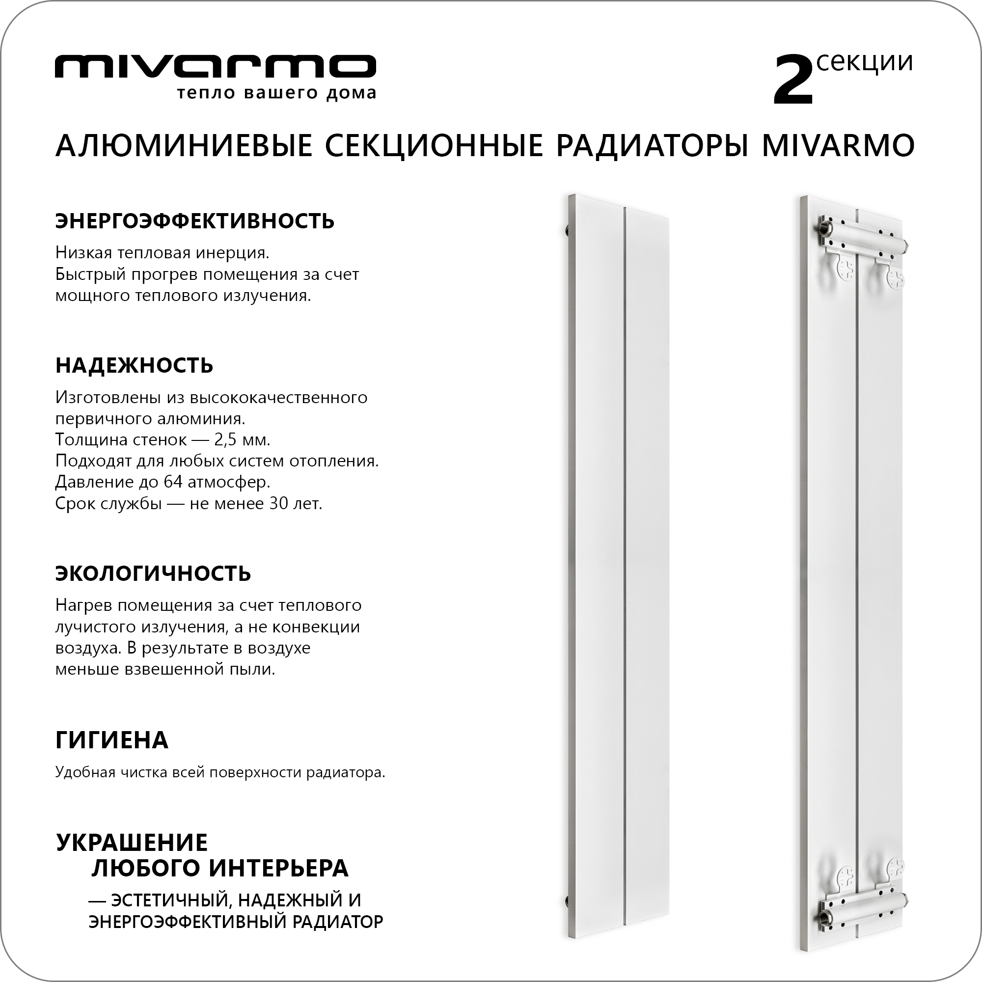 Секционный радиатор отопления Mivarmo 2 секции, горизонтальное/вертикальное подключение 200 см (белый матовый)