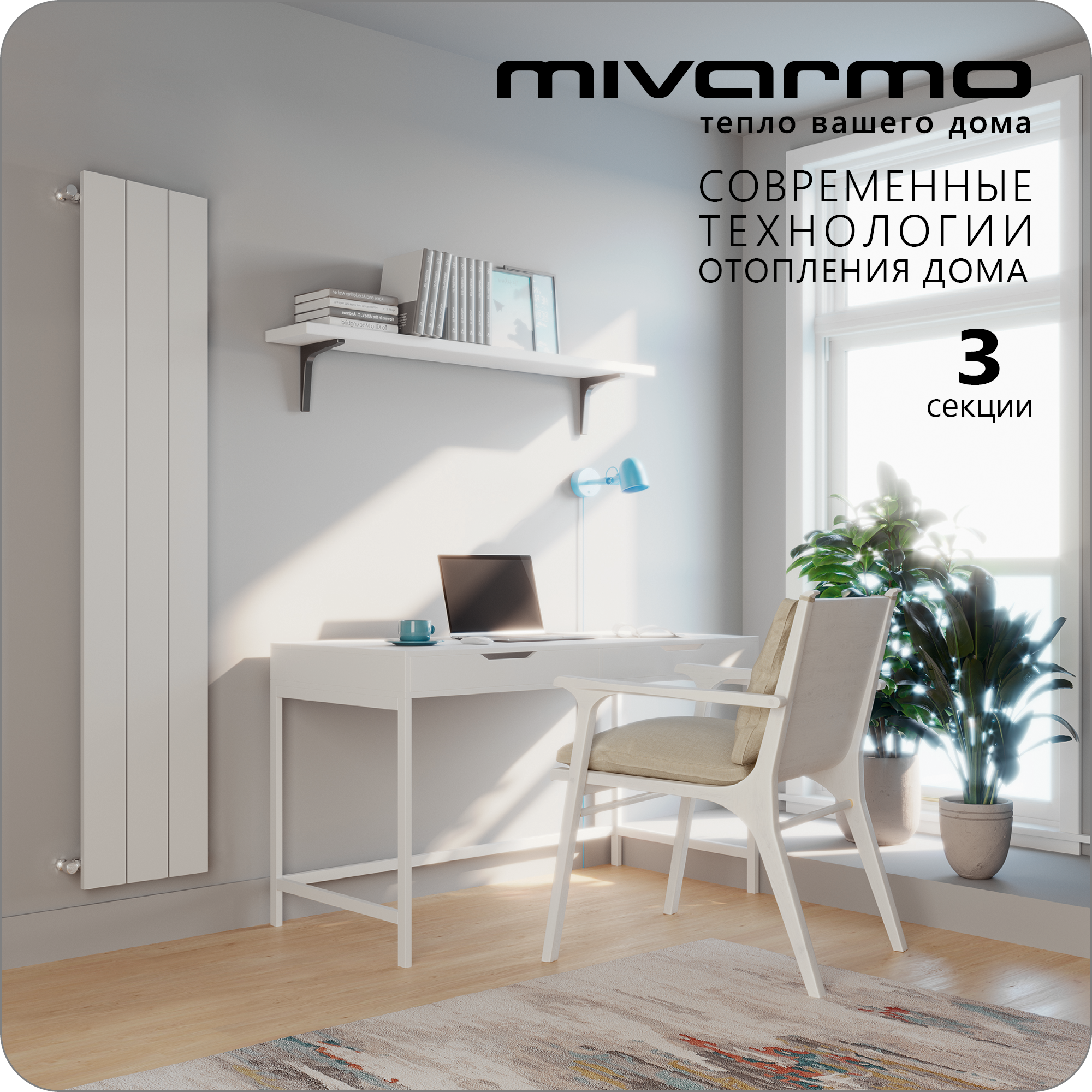 Секционный радиатор отопления Mivarmo 3 секции, горизонтальное/вертикальное подключение 200 см (белый матовый)