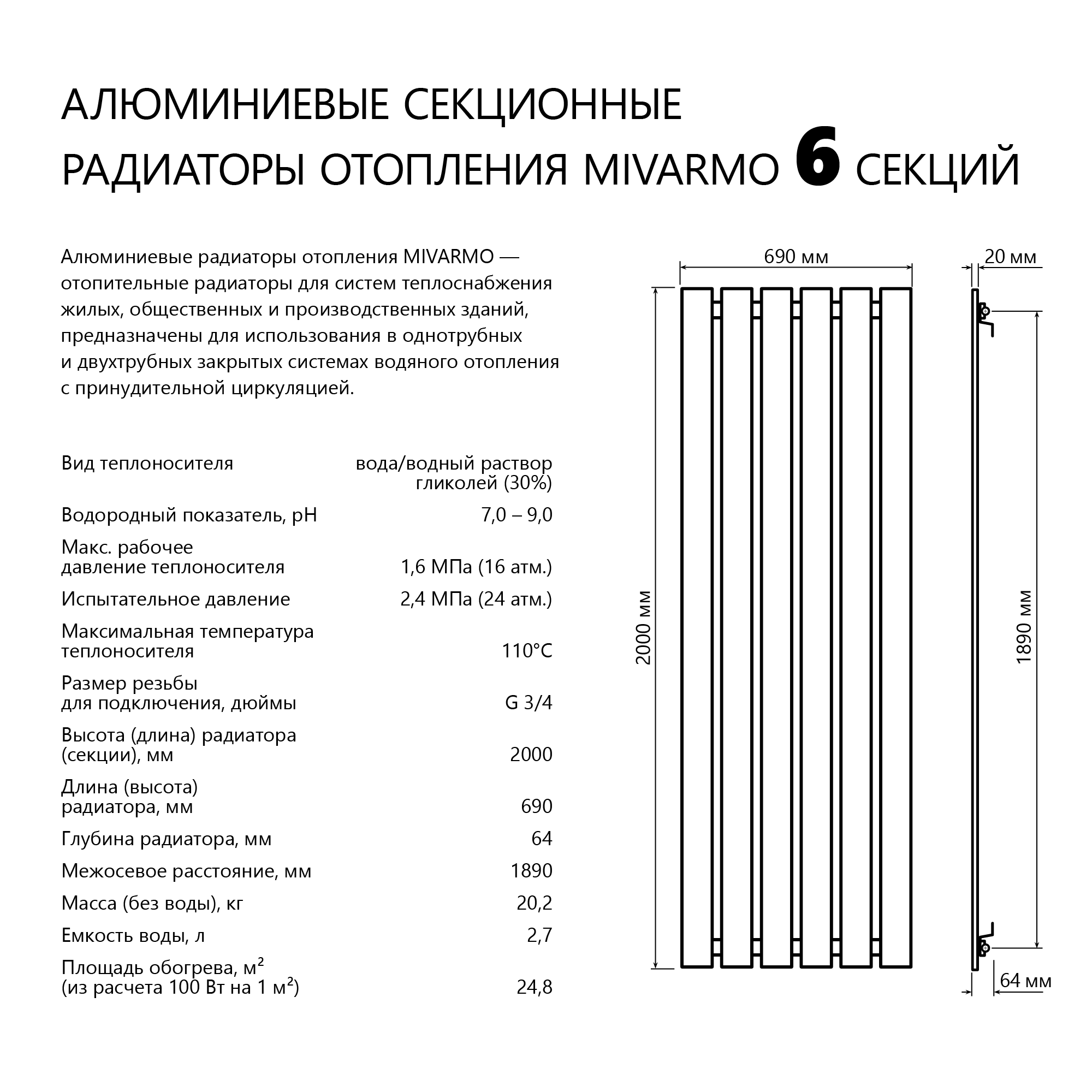 Секционный радиатор отопления Mivarmo 6 секций, горизонтальное/вертикальное подключение 200 см (серебристый матовый)