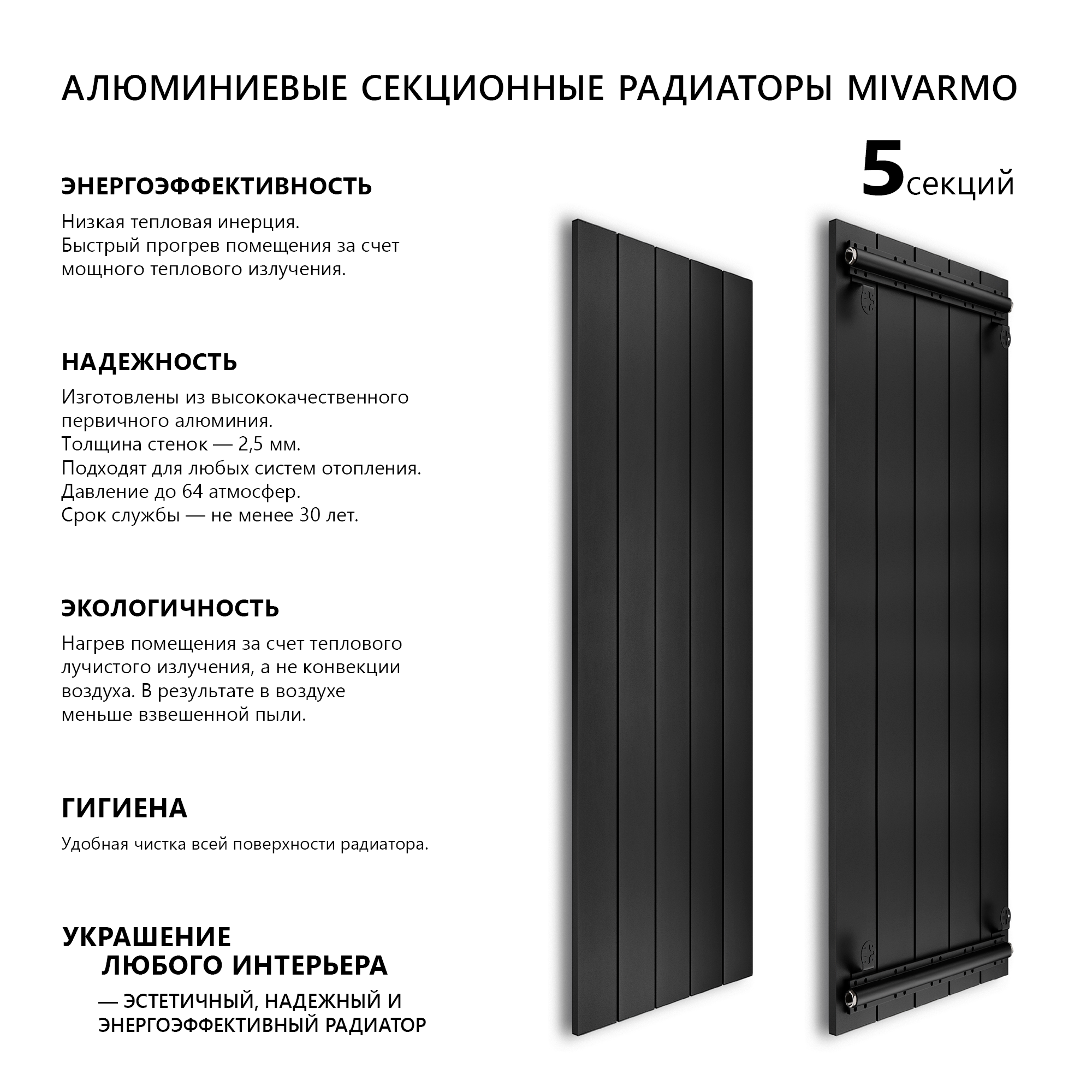 Секционный радиатор отопления Mivarmo 5 секций, горизонтальное/вертикальное подключение 150 см (черный муар)