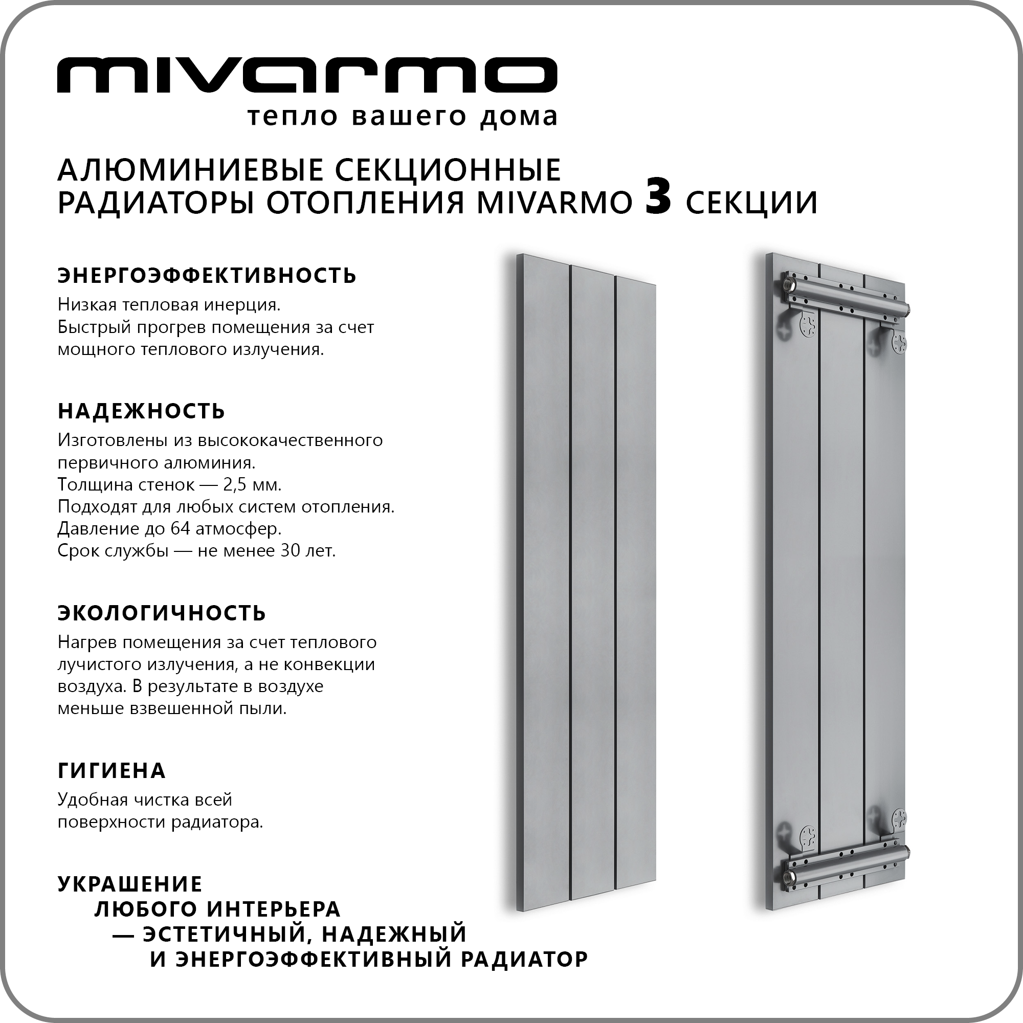 СохранитьСекционный радиатор отопления Mivarmo 3 секции, горизонтальное/вертикальное подключение 175 см (серебристый матовый) интересное: