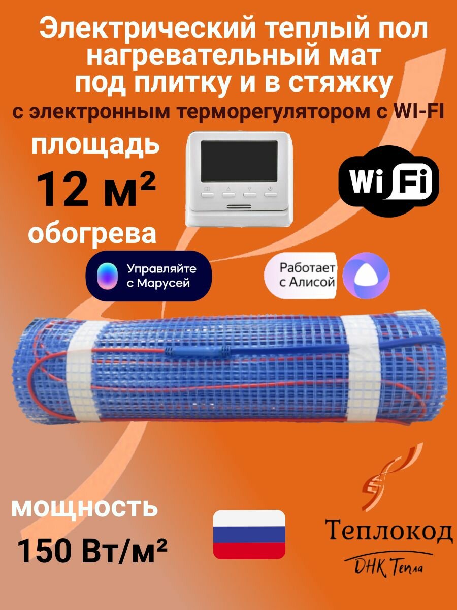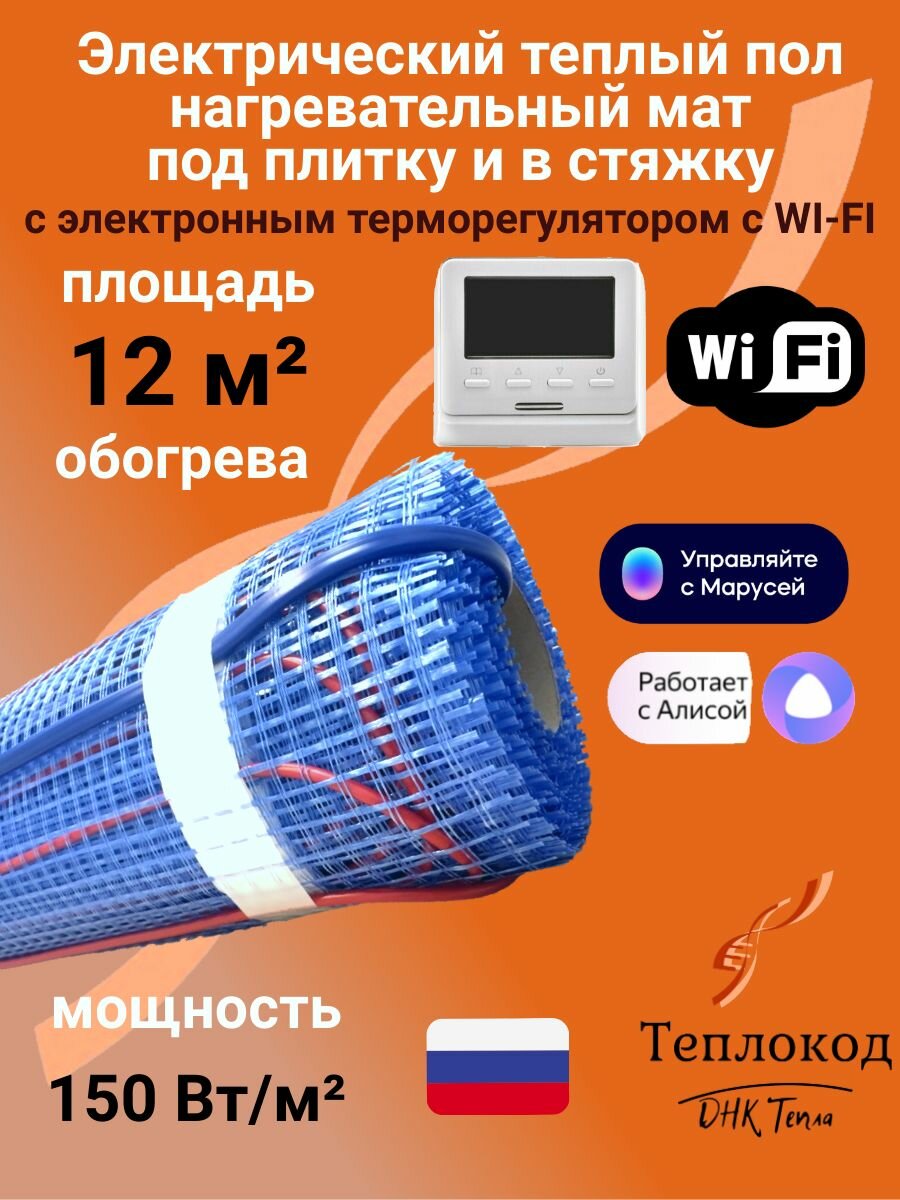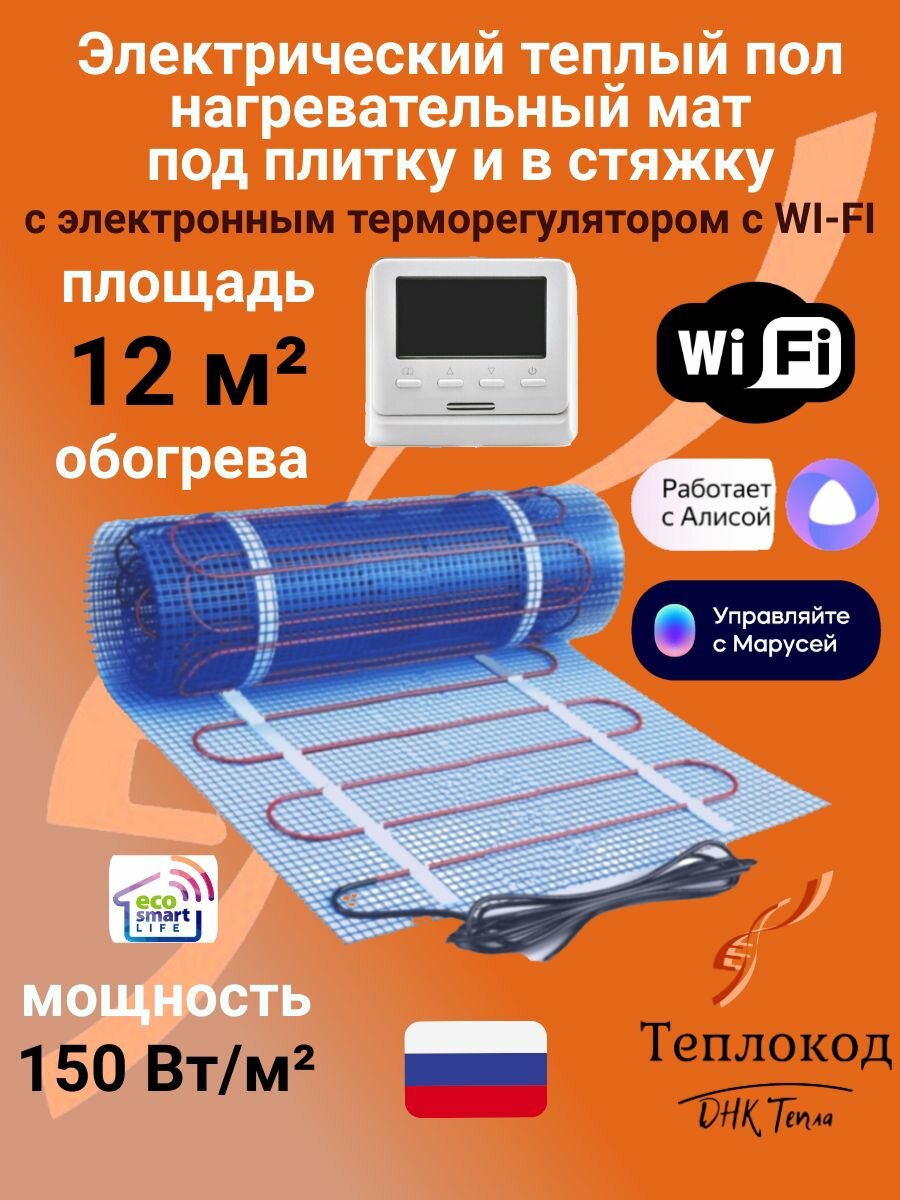 Купить Теплый пол электрический 150 Вт/м2 под плитку и в стяжку (нагревательный мат) 12 м2 с электронным WI-FI терморегулятором