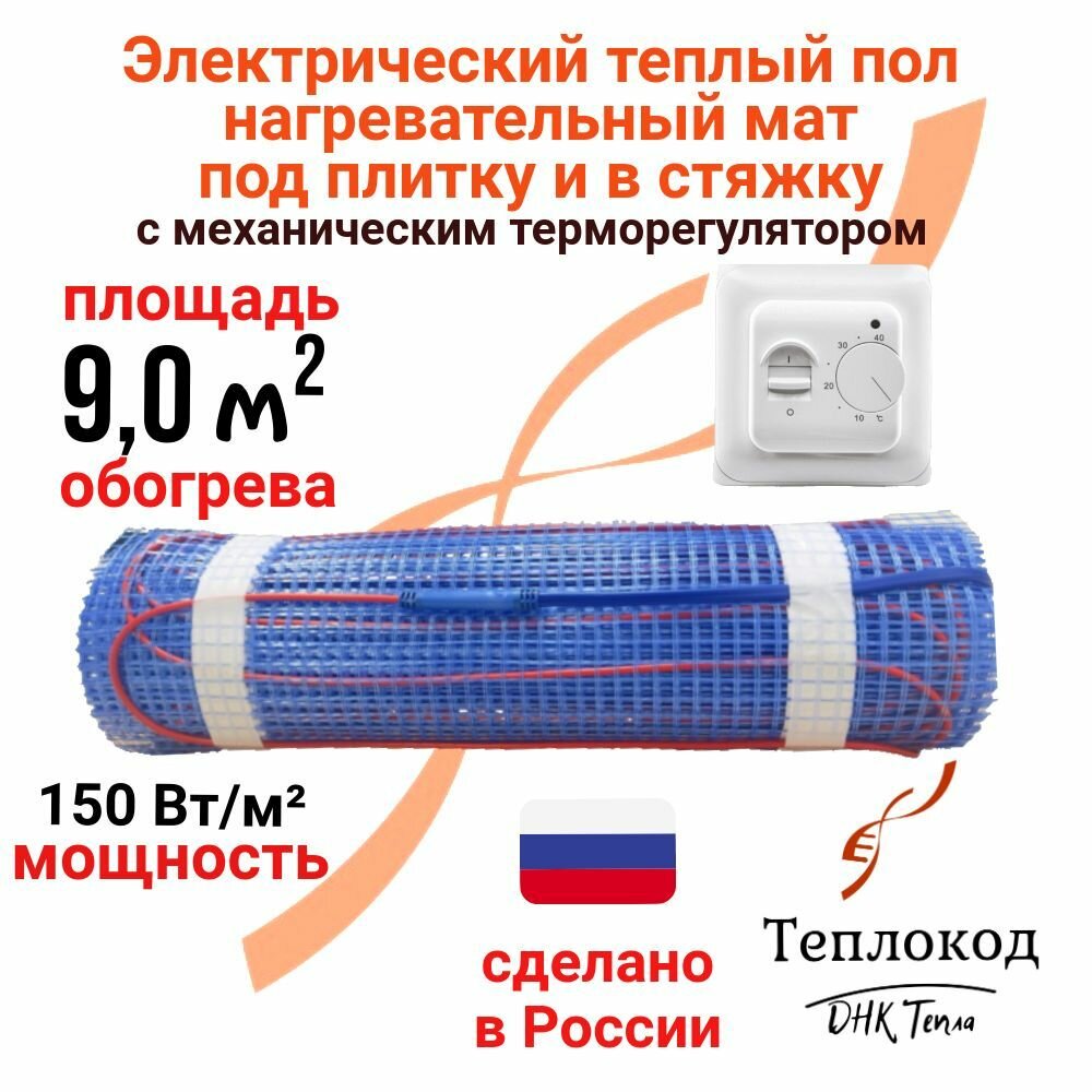 Купить Теплый пол электрический 150 Вт/м2 под плитку и в стяжку (нагревательный мат) 9 м2 с механическим терморегулятором