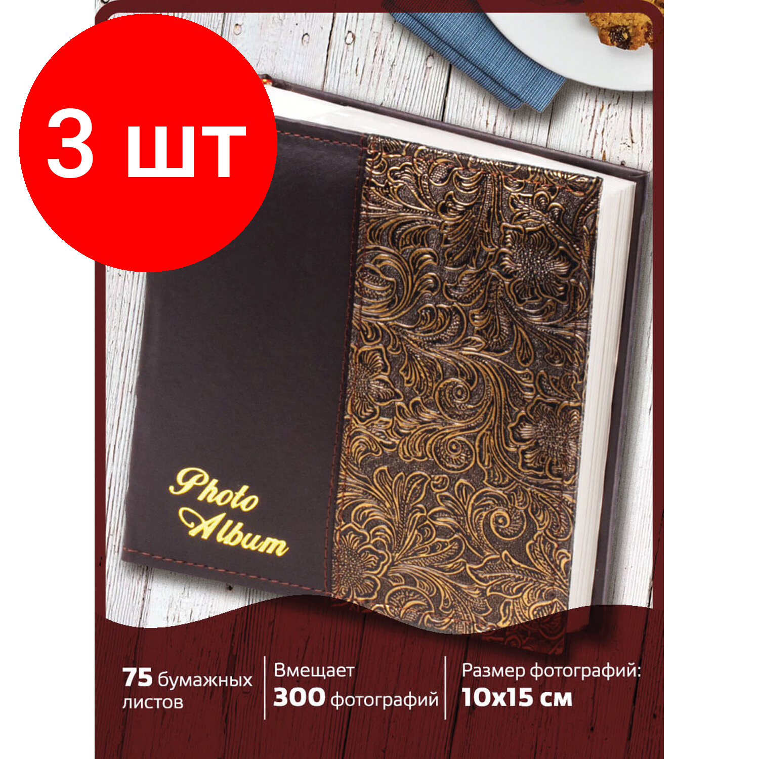 Фотоальбом BRAUBERG на 300 фото 10х15 см, комплект 3 шт., под кожу, бумажные страницы, бокс, коричневый + золото, 391118