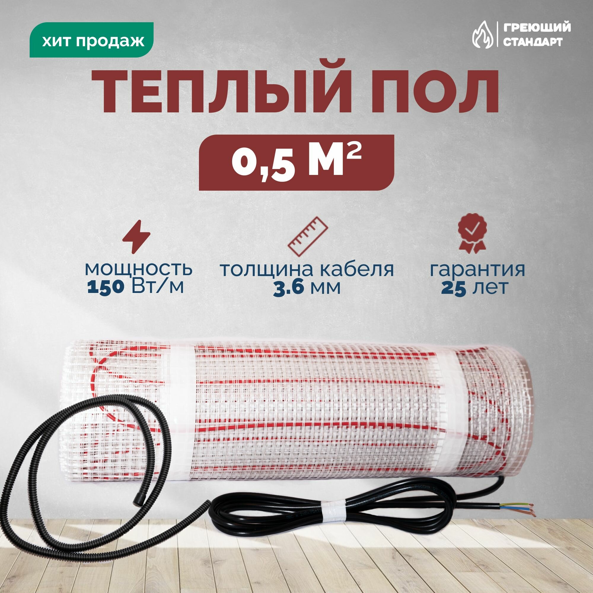 Теплый пол электрический 0,5 м2 150 Вт под плитку с механическим терморегулятором RTC 70.26 (нагревательный мат)