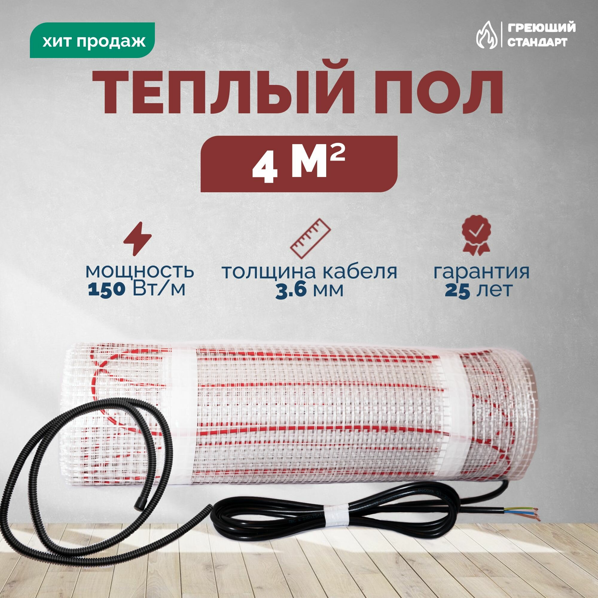 Теплый пол электрический 4 м2 150 Вт под плитку с механическим терморегулятором RTC 70.26 (нагревательный мат)