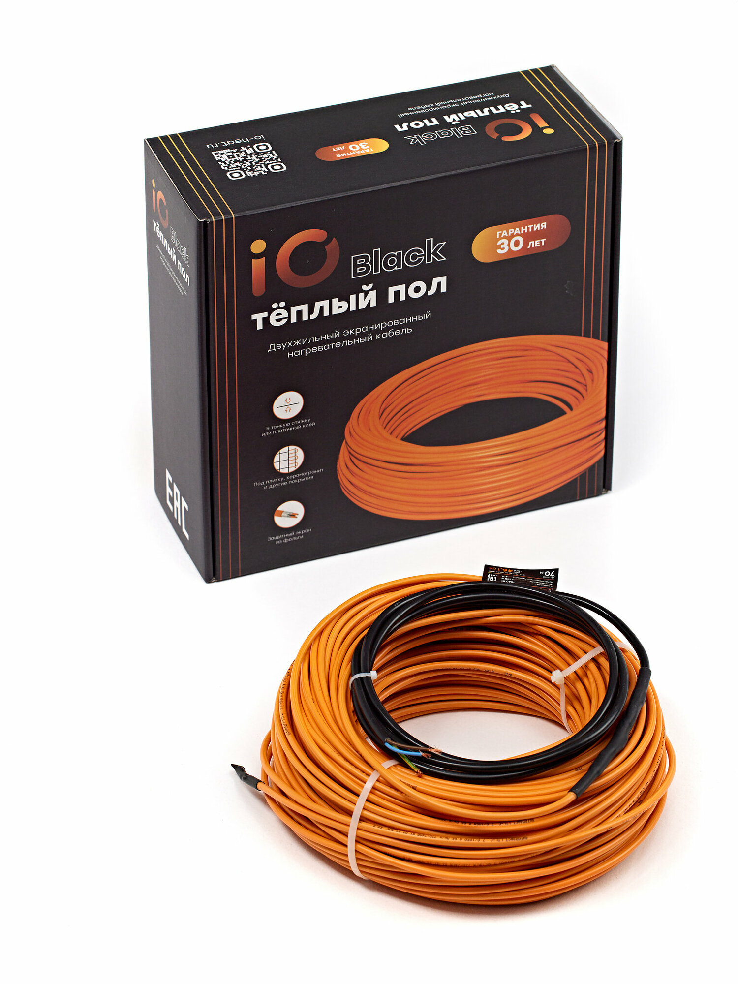 Кабельный тёплый пол электрический в стяжку iO Black 30м 450Вт под плитку, кварцвинил, ламинат, линолеум