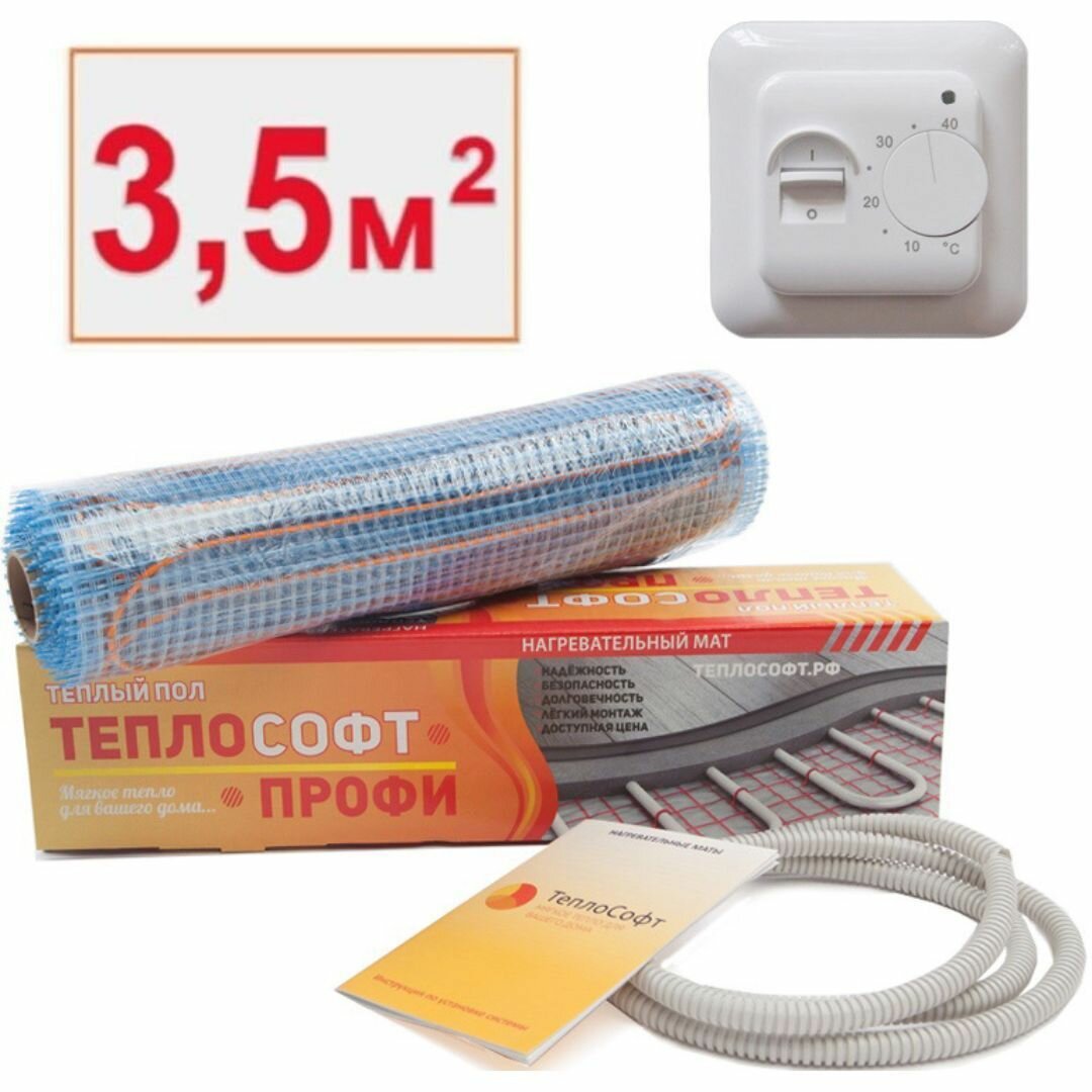 Теплый пол электрический под плитку 3,5 м2 с электронным терморегулятором / Нагревательный мат Теплософт Профи 3,5м. кв.