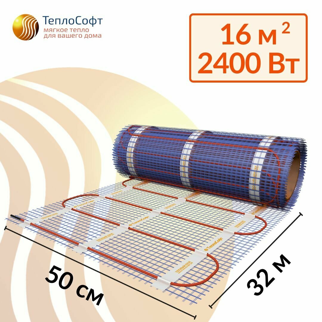 Тёплый пол электрический нагревательный мат Теплософт Профи 16 м2 с сенсорным терморегулятором