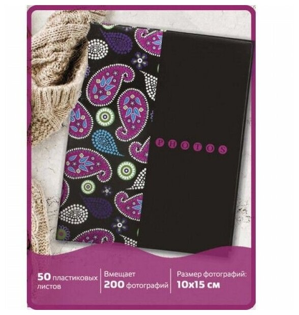 Фотоальбом BRAUBERG на 200 фотографий 10х15 см, твердая обложка, "Пейсли", черный с розовым, 390668 (арт. 390668)