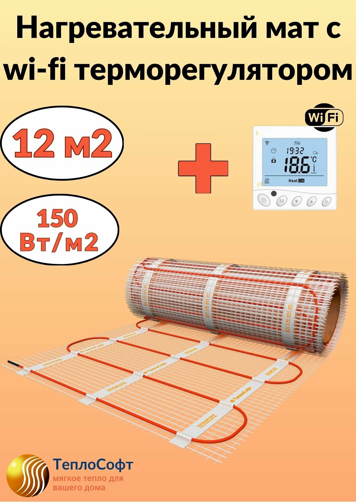 Купить Теплый пол электрический Теплософт под плитку 12 м2 с wi-fi терморегулятором. Нагревательный мат 12м. кв.