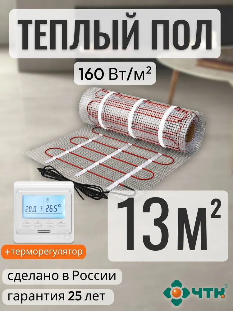 Теплый пол 13 м2 с терморегулятором с Wi-Fi функцией. Тонкий нагревательный мат Silver Roll 13 кв. м