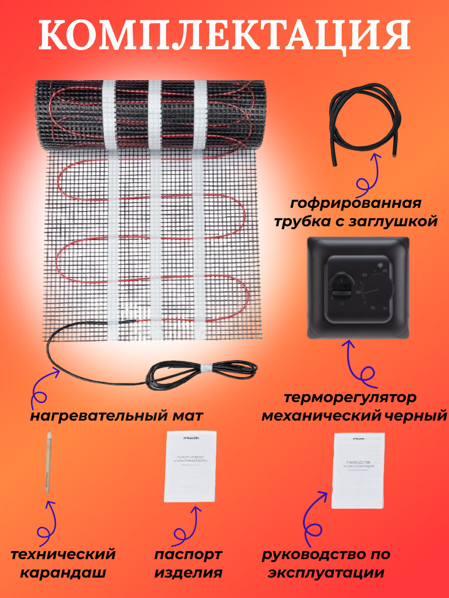 Теплый пол электрический под плитку Nunicho 10 м2 нагревательный мат в стяжку с механическим черным терморегулятором в комплекте