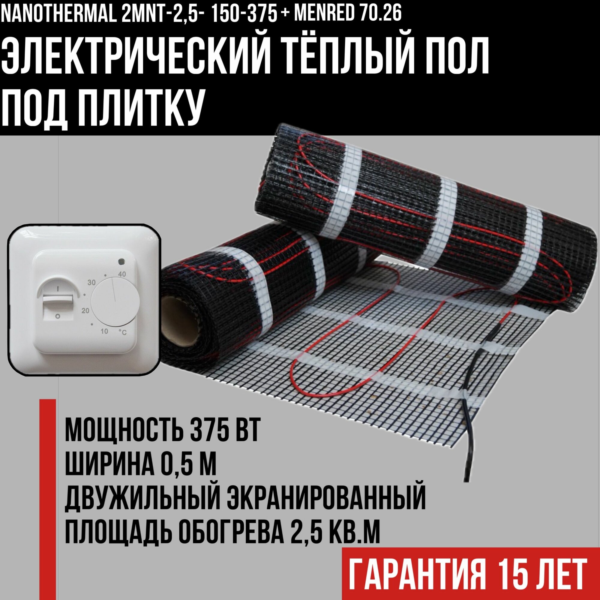 Электрический теплый пол под плитку Nanothermal 1,5 кв. м. с терморегулятором Menred 70.26