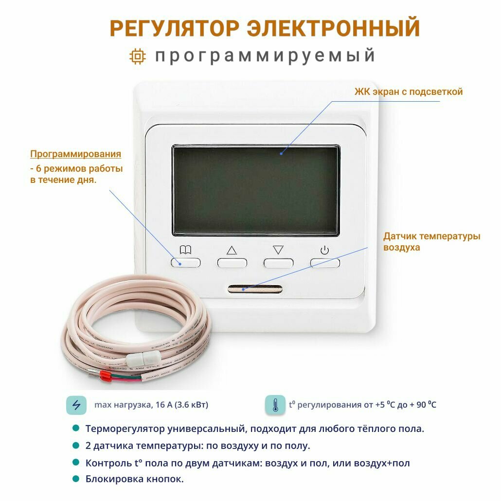 Купить Теплый пол тонкий под кафель 2 м2, 300 Вт, нагревательный мат двухжильный с программируемым регулятором, ЧТК