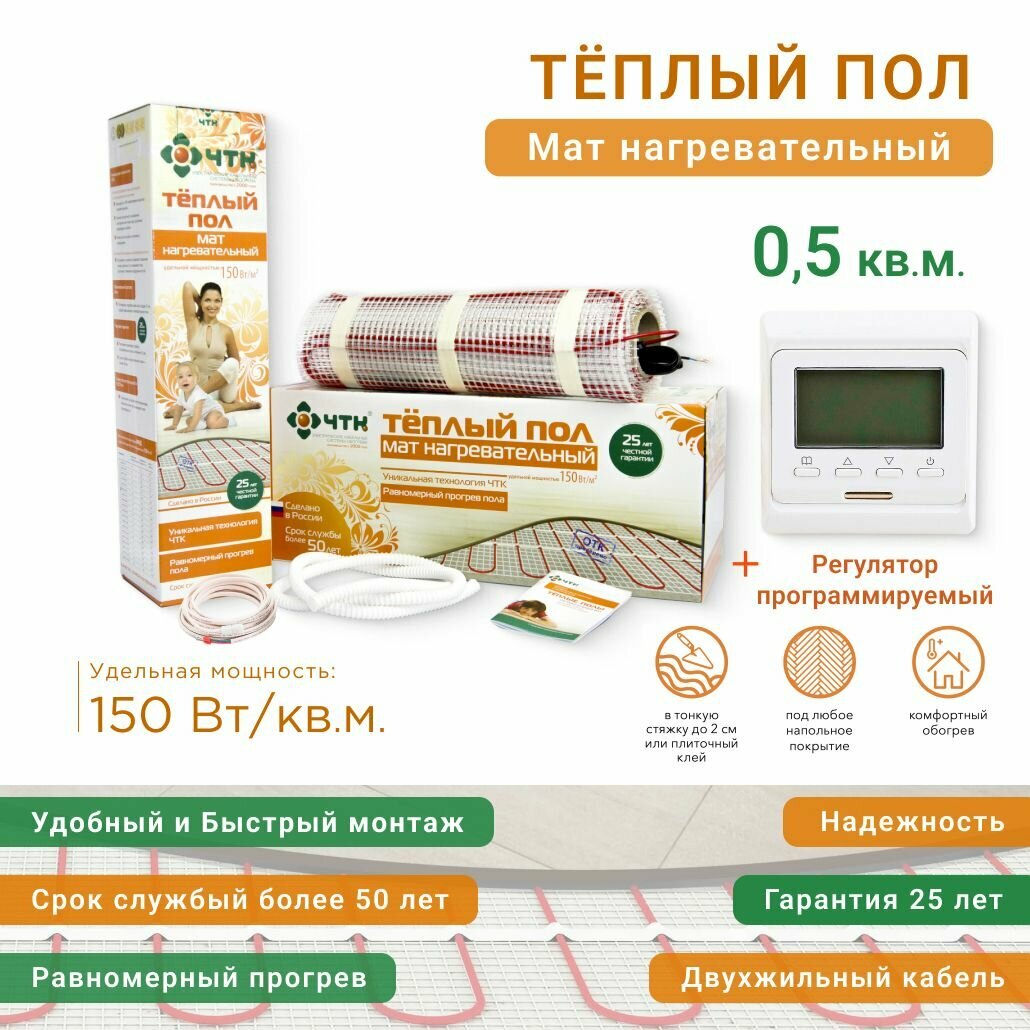 Купить Теплый пол под кафель 0.5 м2, мощность 75 Вт, мат нагревательный двухжильный с программируемым регулятором