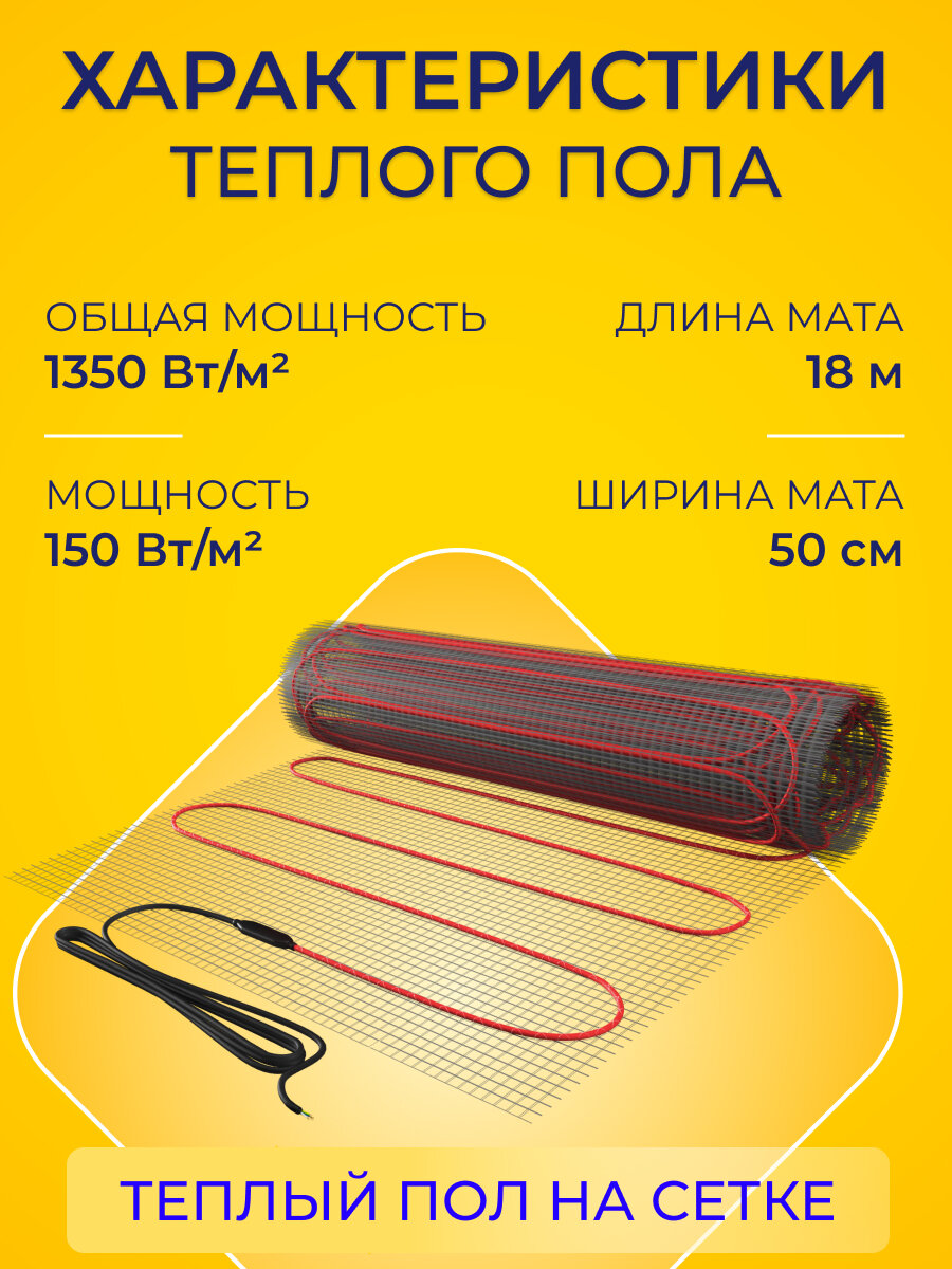 Теплый пол под кафель 9 м2, мощность 1350 Вт, мат нагревательный на сетке, с регулятором
