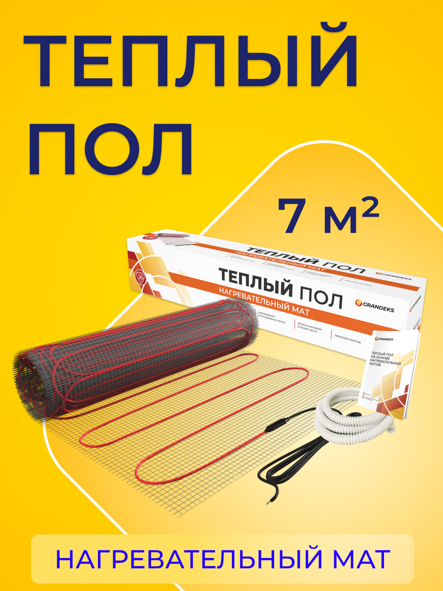 Теплый пол тонкий Grandeks 7 кв м, нагревательный мат двухжильный на сетке, терморегулятор в комплекте