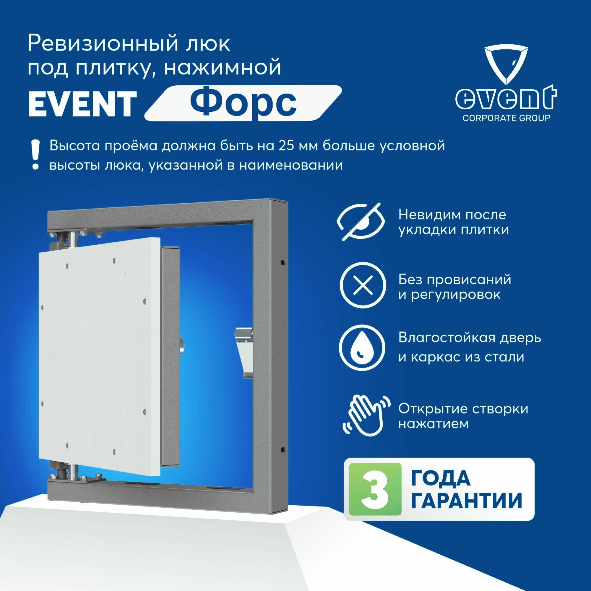 Люк Эвент Форс 30х30. Ревизионный люк нажимной под плитку, без провисания. Фактический размер люка 24,5х32,5 см