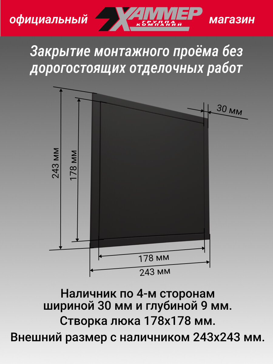 Люк металлический Хаммер 30х30 (ШхВ) см, нажимной, сталь, черный, петли на стороне 30