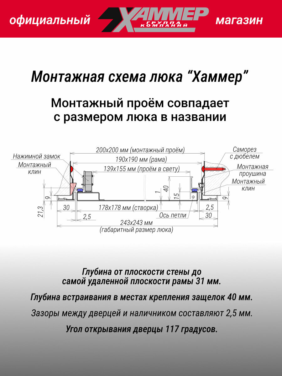 СохранитьЛюк металлический Хаммер 20Х20 (ШхВ) см, нажимной, сталь, черный, петли на стороне 20 интересное: