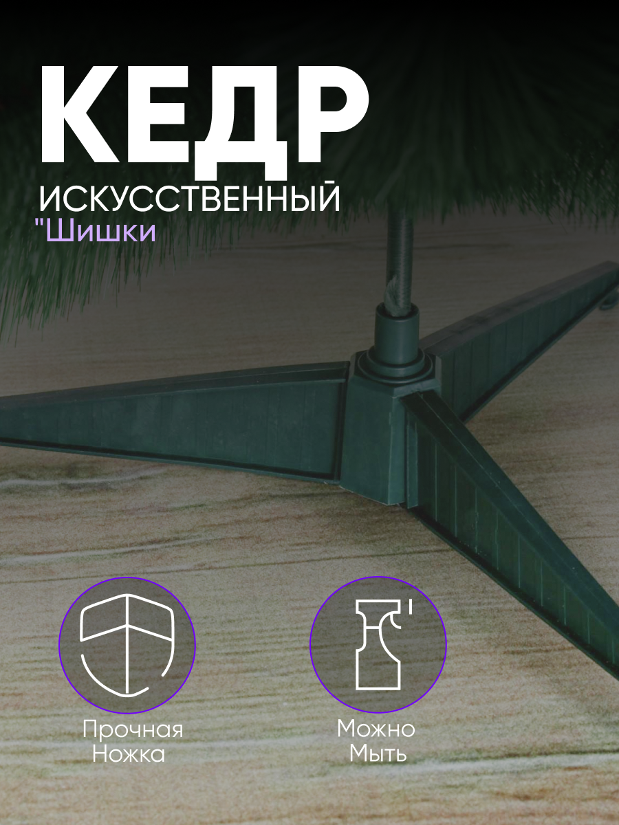 Кедр зеленый шишки 180 см, d игл 10 см, d нижнего яруса 100 см, 235 веток, металл подставка