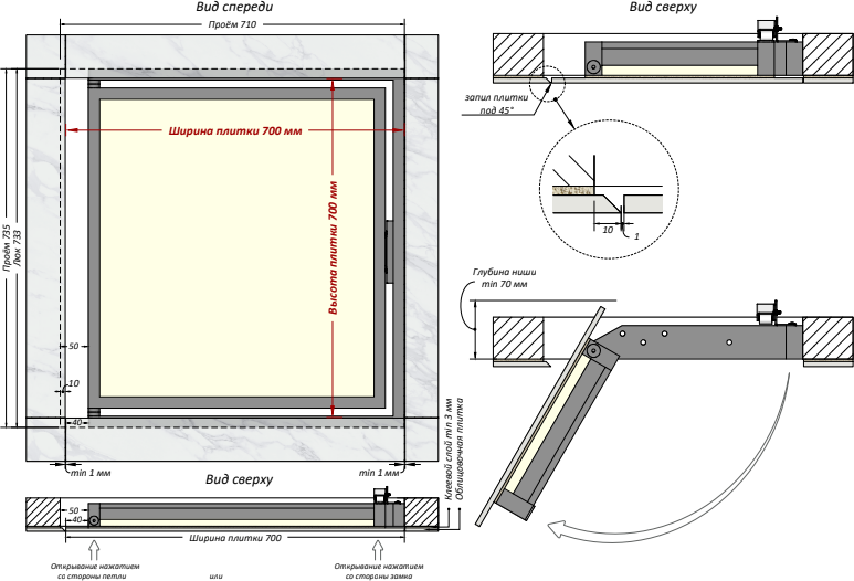 СохранитьЛюк ревизионный под плитку SHAGMA 700х700 мм сантехнический фактический размер 660(ширина) х 733(высота) мм интересное: