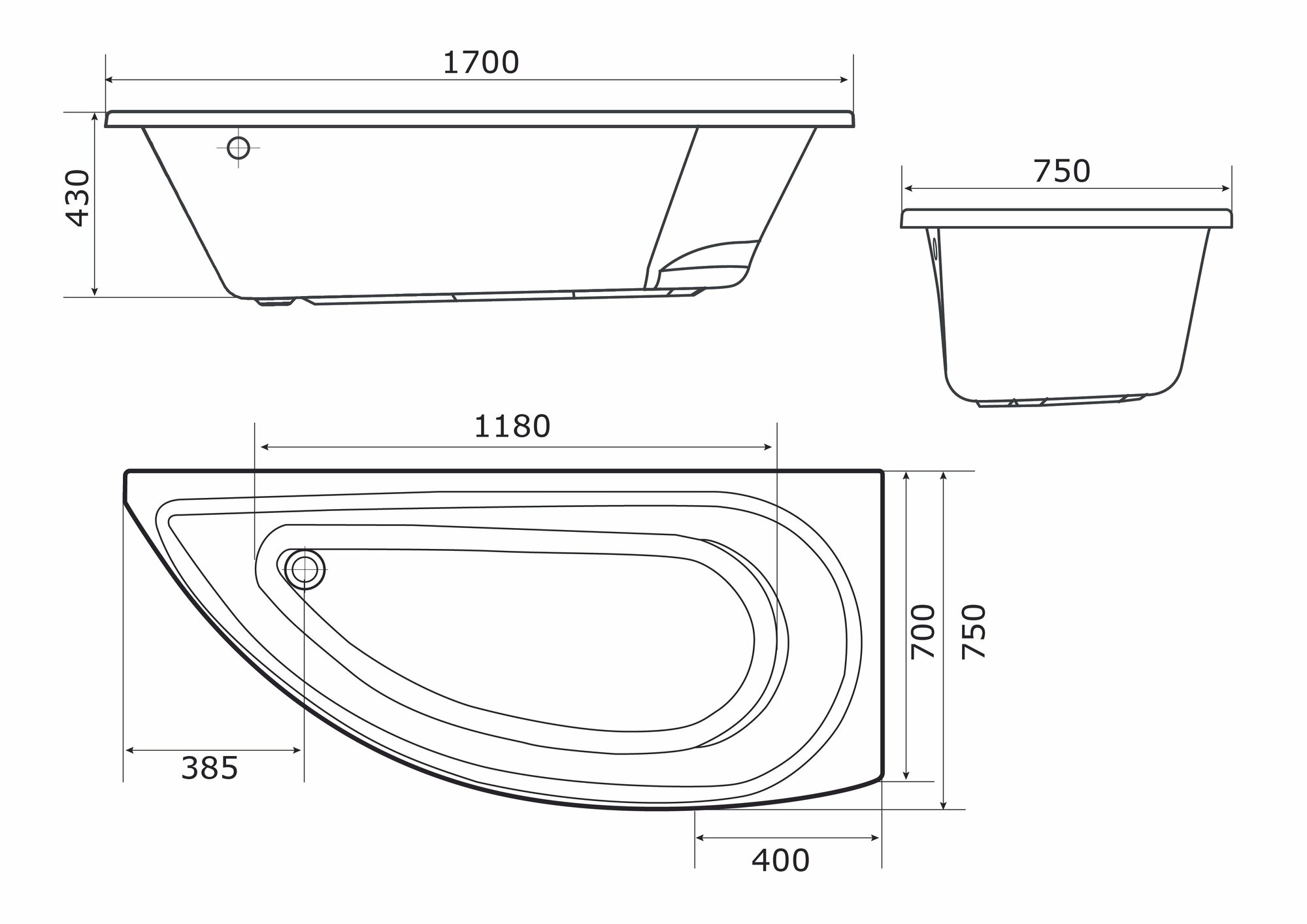 Ванна акриловая 170х75 см PICCOLO в наборе 3 в 1: Ванна левосторонняя, металлический каркас, слив-перелив 01пк1775лкс2+