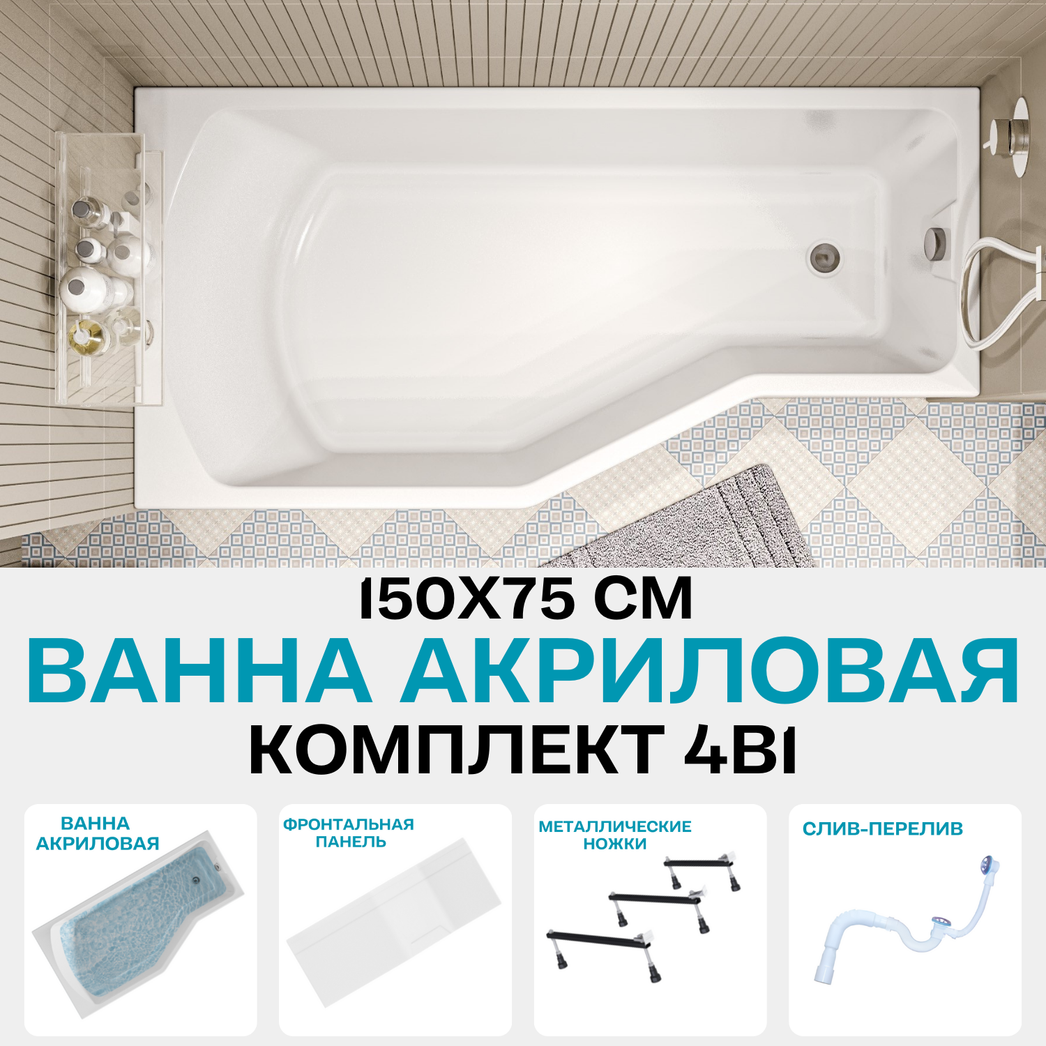 Ванна акриловая 150х75 см 1MARKA Convey в наборе 3 в 1: Асимметричная ванна левый угол, металлические ножки, слив-перелив хром 01кон1575лкс2+