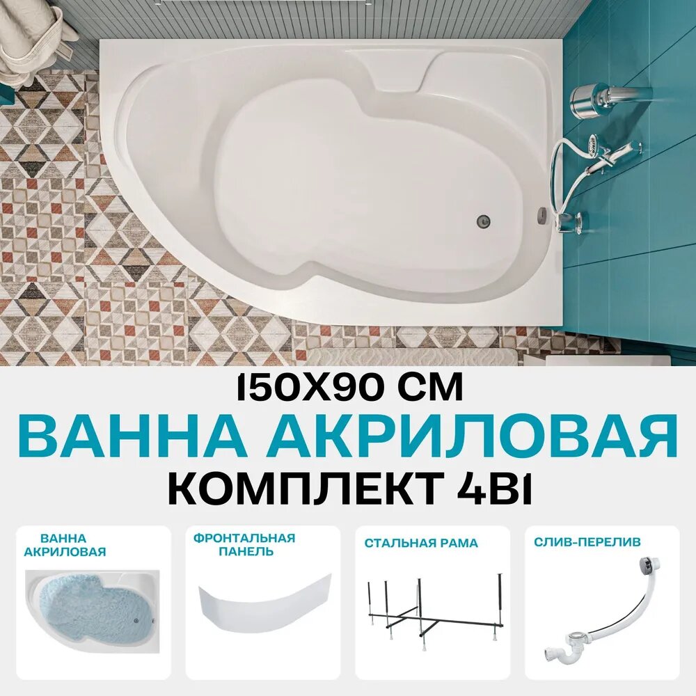Ванна акриловая 150x90 см 1MARKA DIANA в наборе 3 в 1: Асимметричная ванна левый угол, усиленный металлический каркас, слив-перелив хром 01ди1590лкс2+