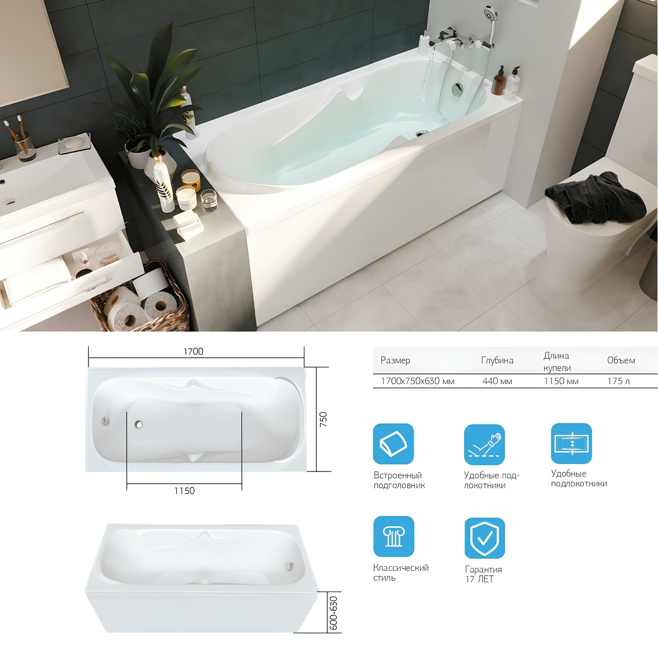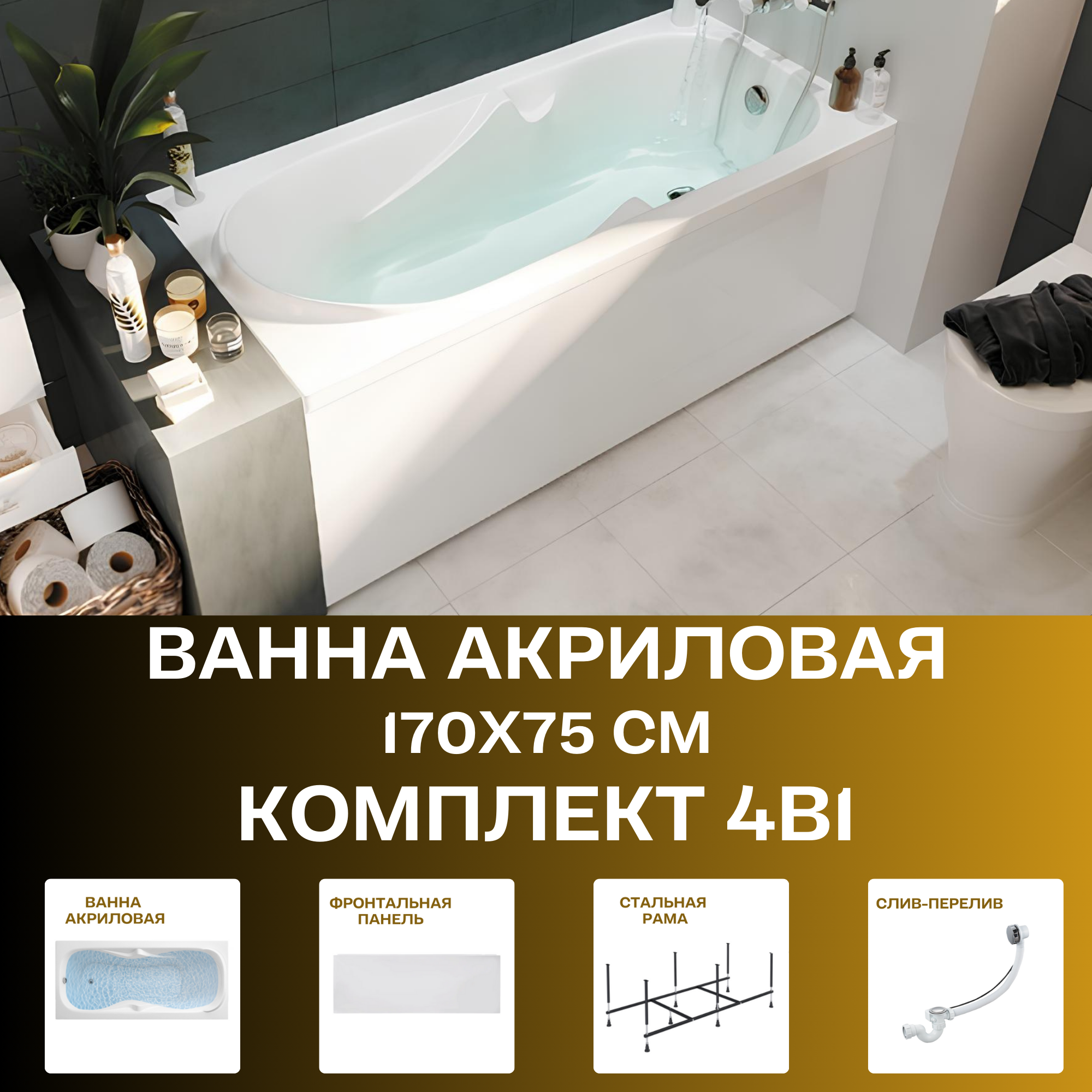 Ванна акриловая 170х75 см DIPSA комплект 4в1: Акриловая ванна, фронтальная панель, рама, слив-перелив 12017894кп интересное: