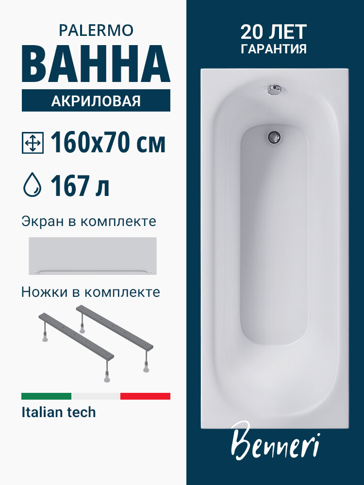 Акриловая ванна Benneri Palermo 170x70 прямоугольная, без ножек и экрана