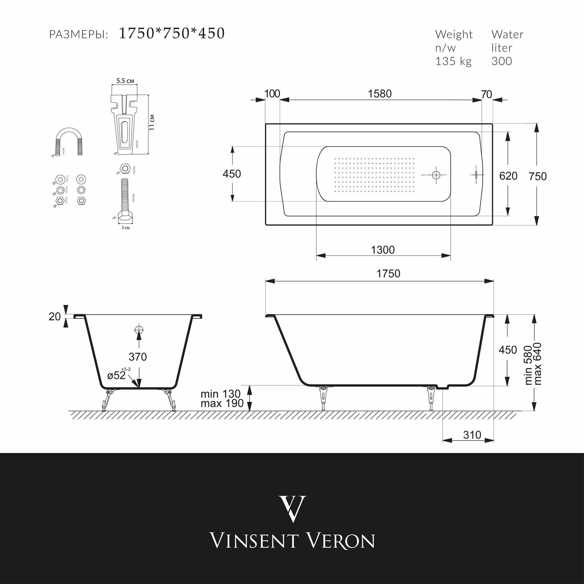 СохранитьЧугунная ванна Vinsent Veron Devon 175x75x45 с антискользящим покрытием интересное: