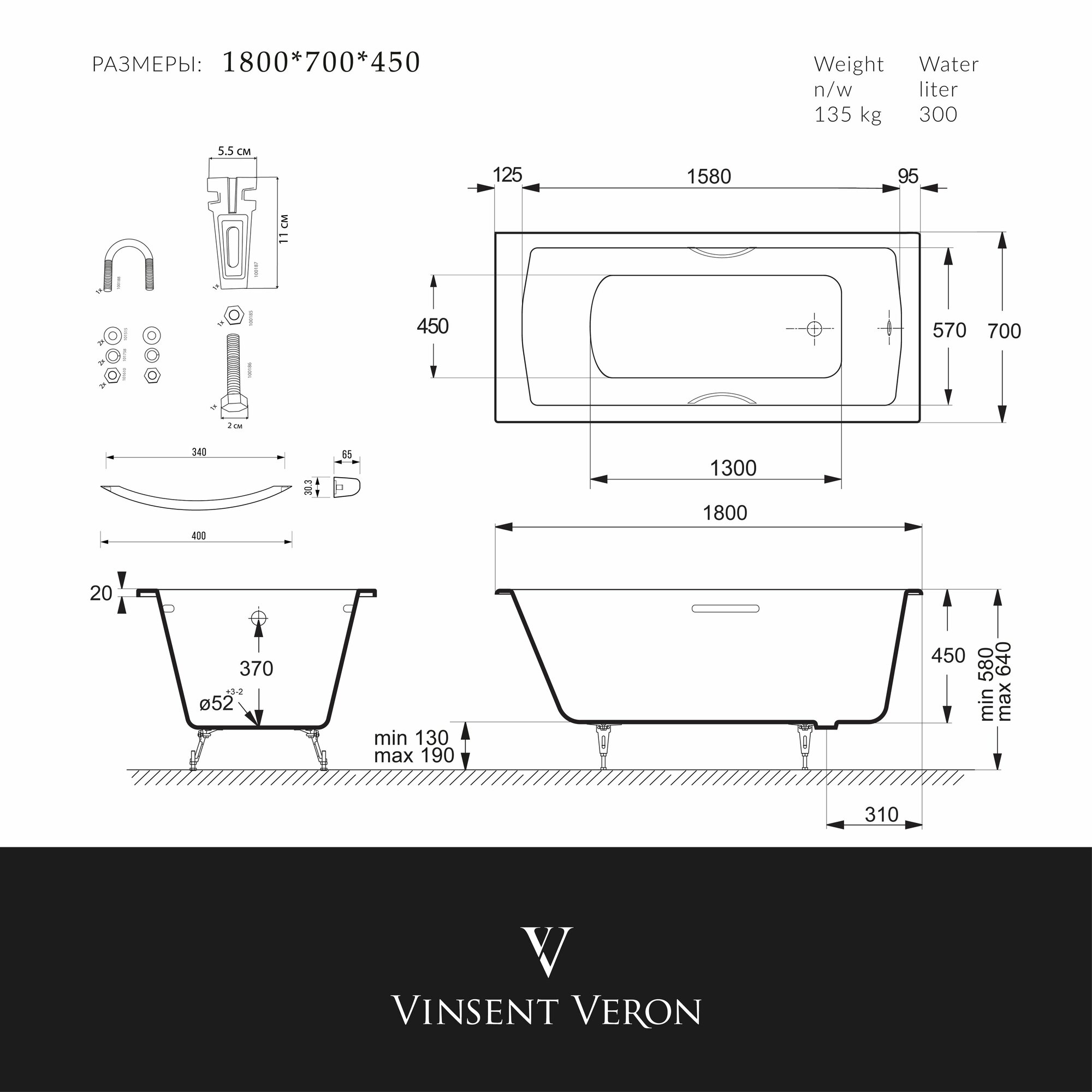 Чугунная ванна Vinsent Veron Devon 180x70x45 с антискользящим покрытием