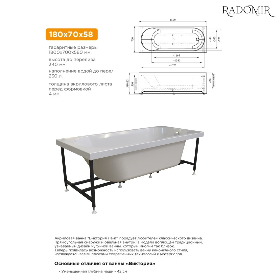 Акриловая ванна Радомир Виктория ЛАЙТ 170х75 на металлическом каркасе. 2-01-0-0-1-259Р интересное: