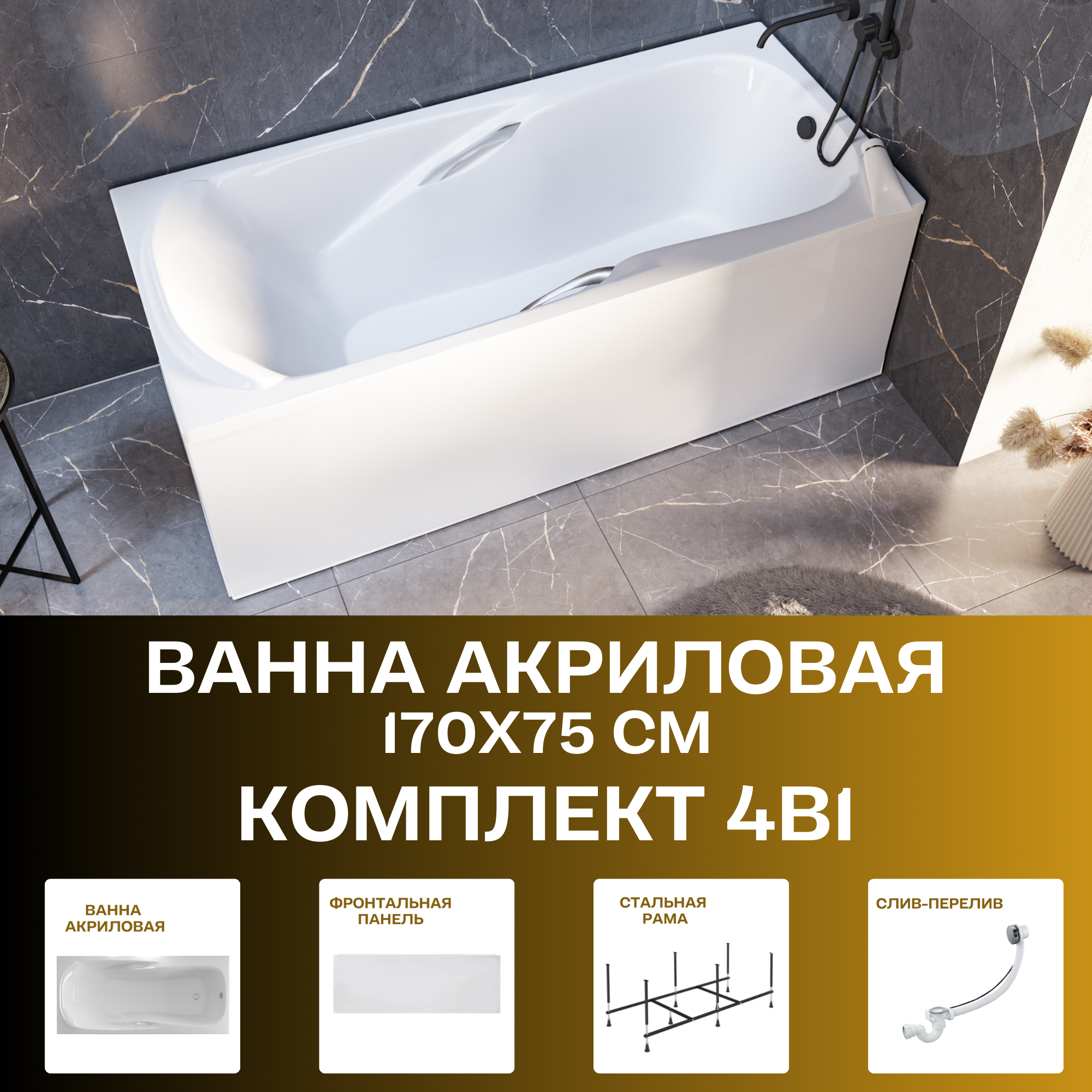 Ванна акриловая 170х75 см CALYPSO комплект 4в1: Акриловая ванна, фронтальная панель, рама, слив-перелив 01каи1775кп интересное:
