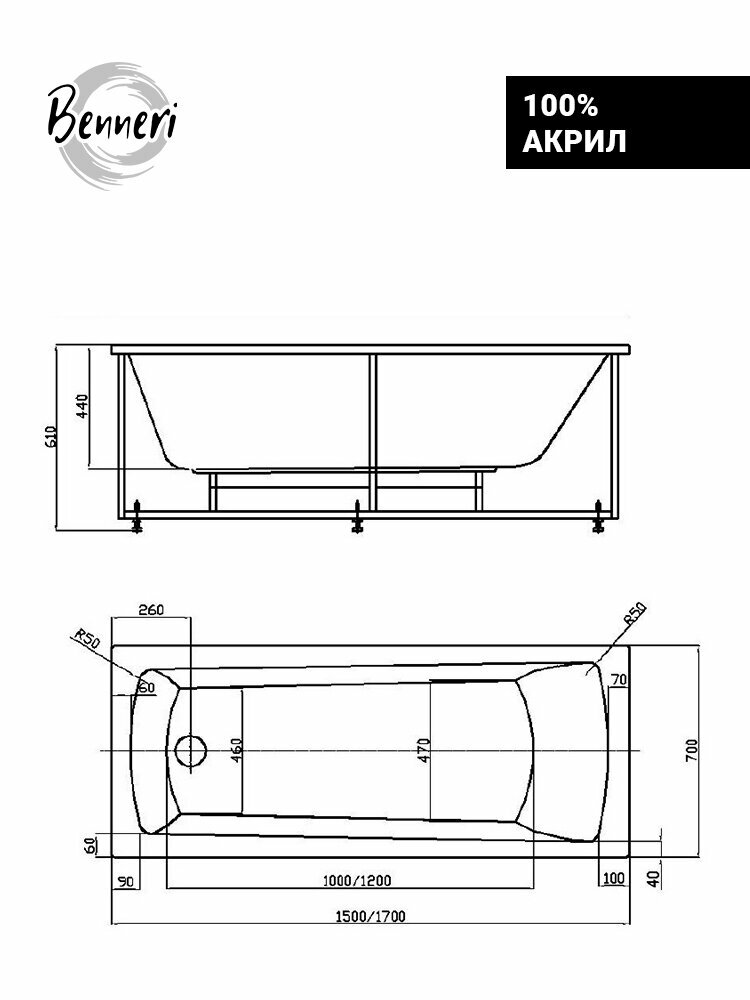 Ванна прямоугольная акриловая Benneri Modena 170x70, в комплекте с ножками