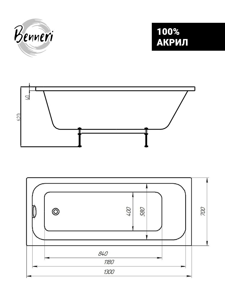 Прямоугольная акриловая ванна Benneri Modena 130x70, в комплекте с ножками и фронтальной панелью