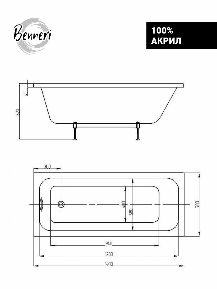 Акриловая прямоугольная ванна Benneri Modena 140x70, в комплекте с ножками